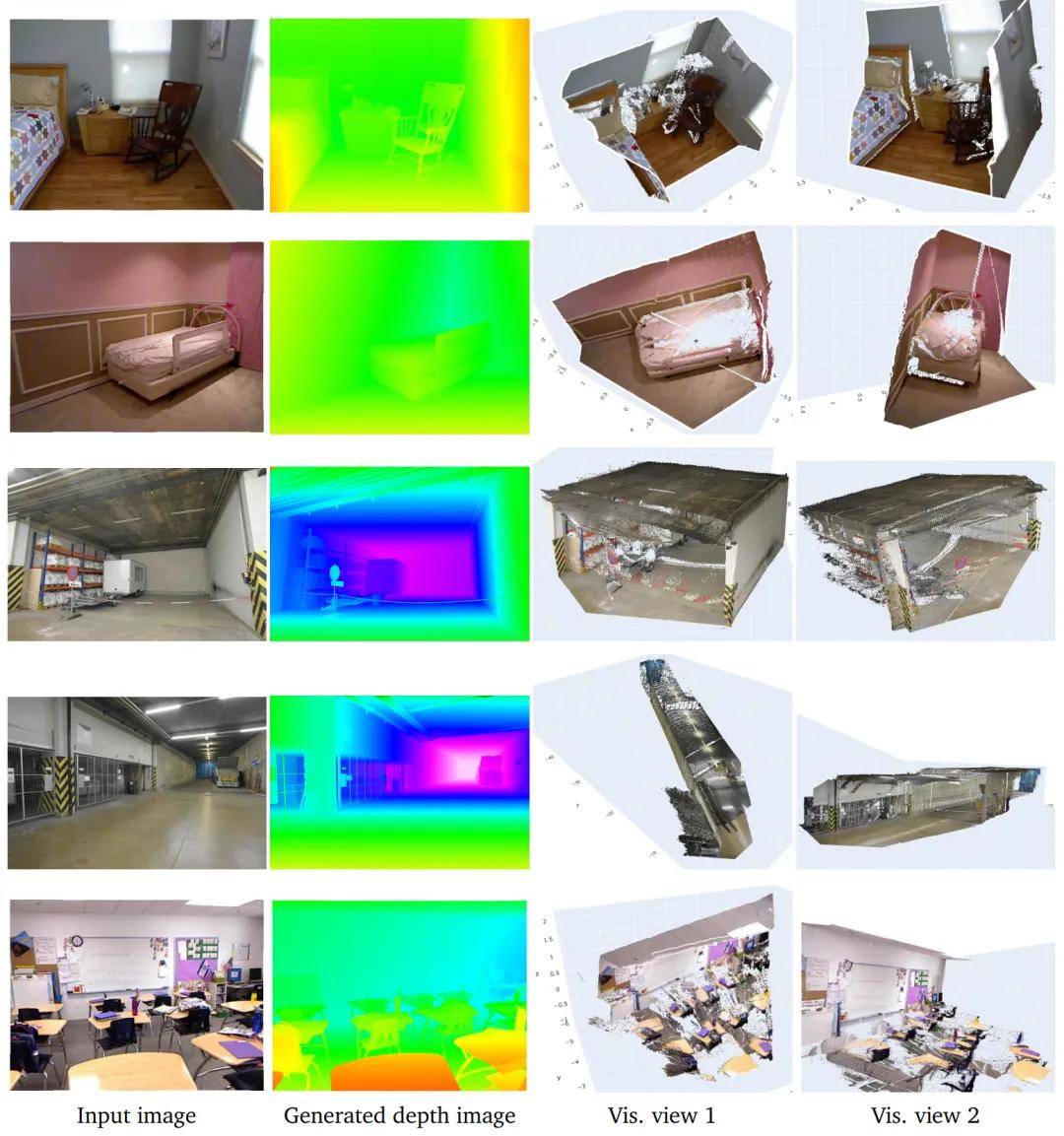 在做 3D 深度估计时,他们则设计了一套严格可逆的数学映射机制(利用幂律变换),将物理世界中从 0 到无穷大的度量深度映射到 RGB 色彩立方体的边缘上。模型输出一张渐变的「伪色彩图」,解码后就能直接换算成精准的物理深度距离。