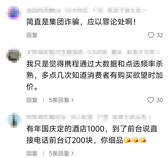 更有甚者,国庆期间通过携程预订1000元的酒店,到店后才得知直接联系前台只需200元,这样的定价差简直令人咋舌。