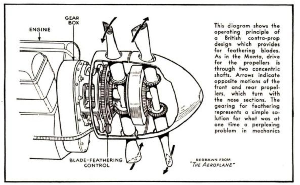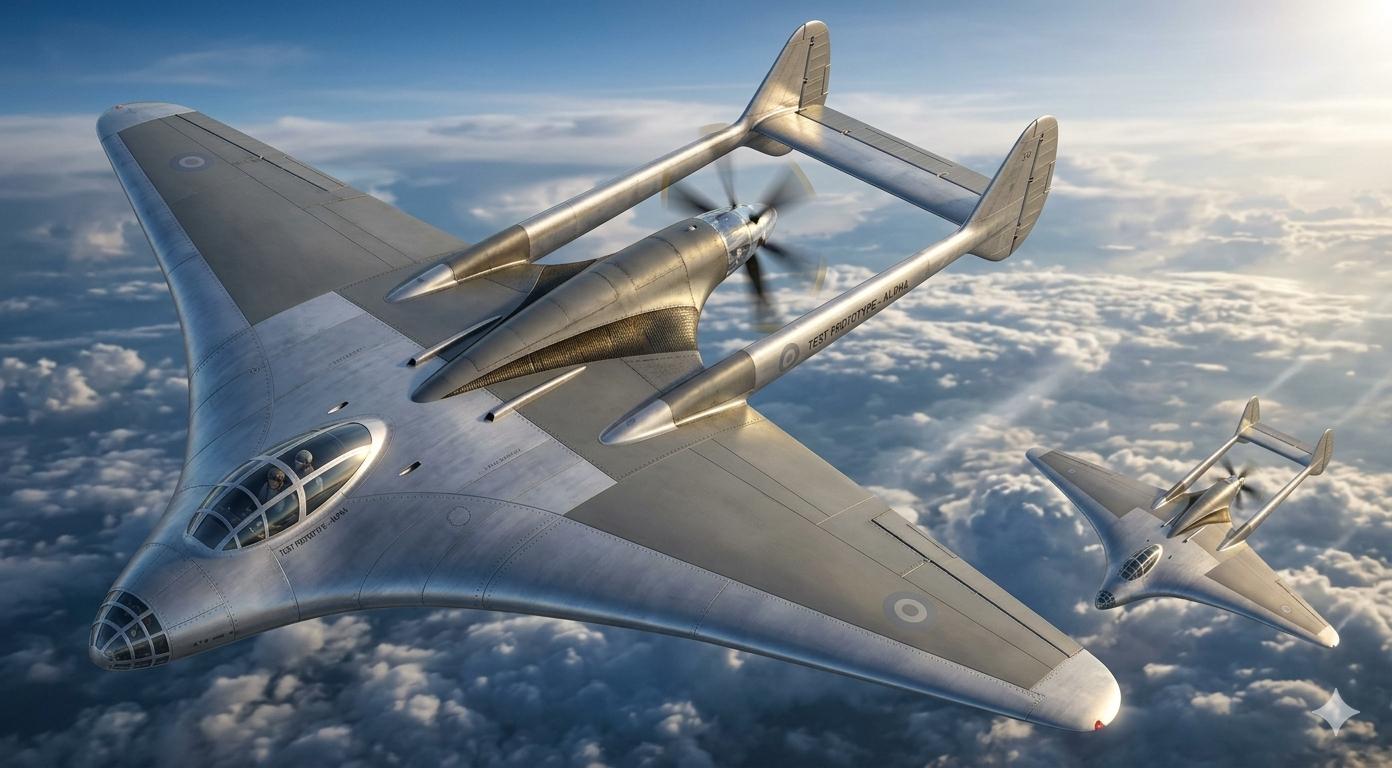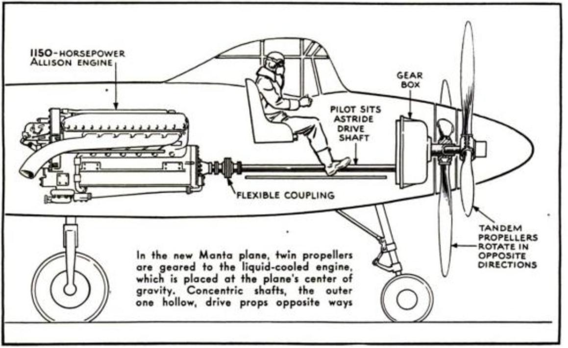 第一版本命名为 “蝙蝠”,设计为双尾梁,与英国的吸血鬼战斗机非常相似,发动机完全浸没于机翼内,延长的螺旋桨轴驱动反向旋转螺旋桨。它应由一台 2600 马力的艾利森 V-3420 发动机驱动,这是一种由两台 12 缸 V-1710 发动机组成的笨重发动机,合并在同一曲轴箱中。