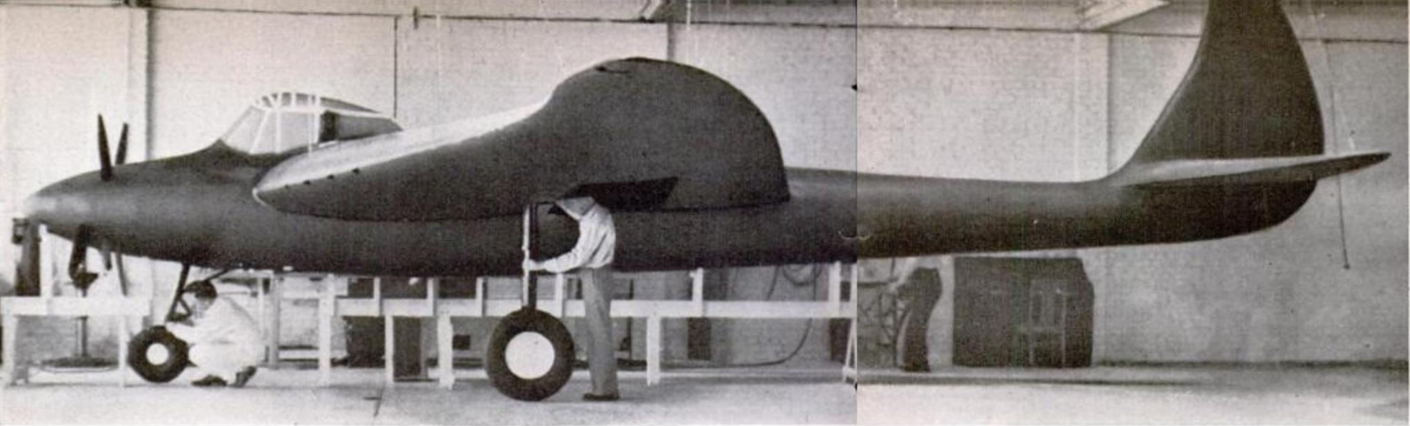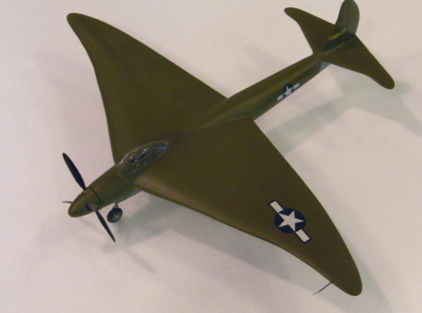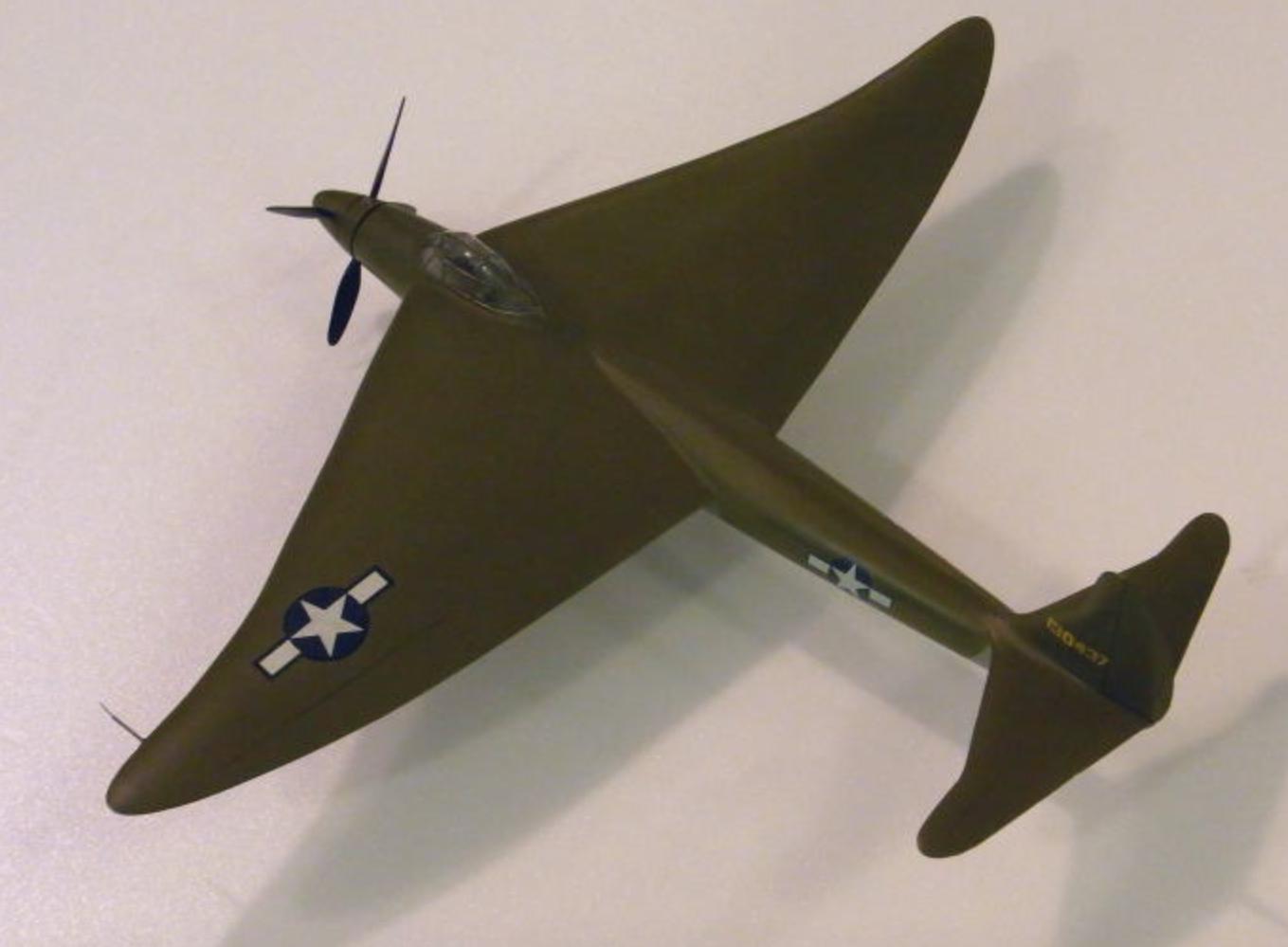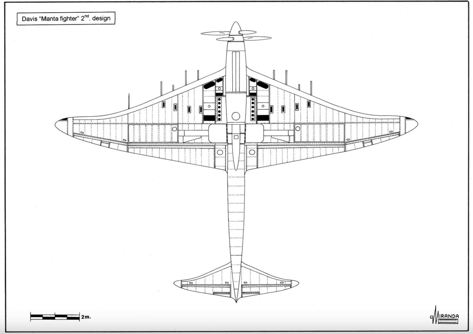 1942 年, 经过两年的风洞实验,戴维斯的“蝙蝠”设计重新设计为“ 魔鬼鱼 ”(蝠鲼) ,配备了牵引螺旋桨和传统的单机身和尾翼。