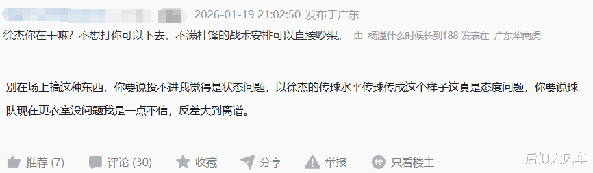 赛后,不少广东球迷对于徐杰也发表了不同看法,支持徐杰的球迷继续为他加油鼓劲,不满徐杰表现的球迷则是对徐杰提出了批评,甚至还有球迷直接嘲讽徐杰:段睿琪撞一下,他就东倒西歪;还有球迷则认为徐杰是最近和女朋友走的太近了,心思完全没有放在球场上。