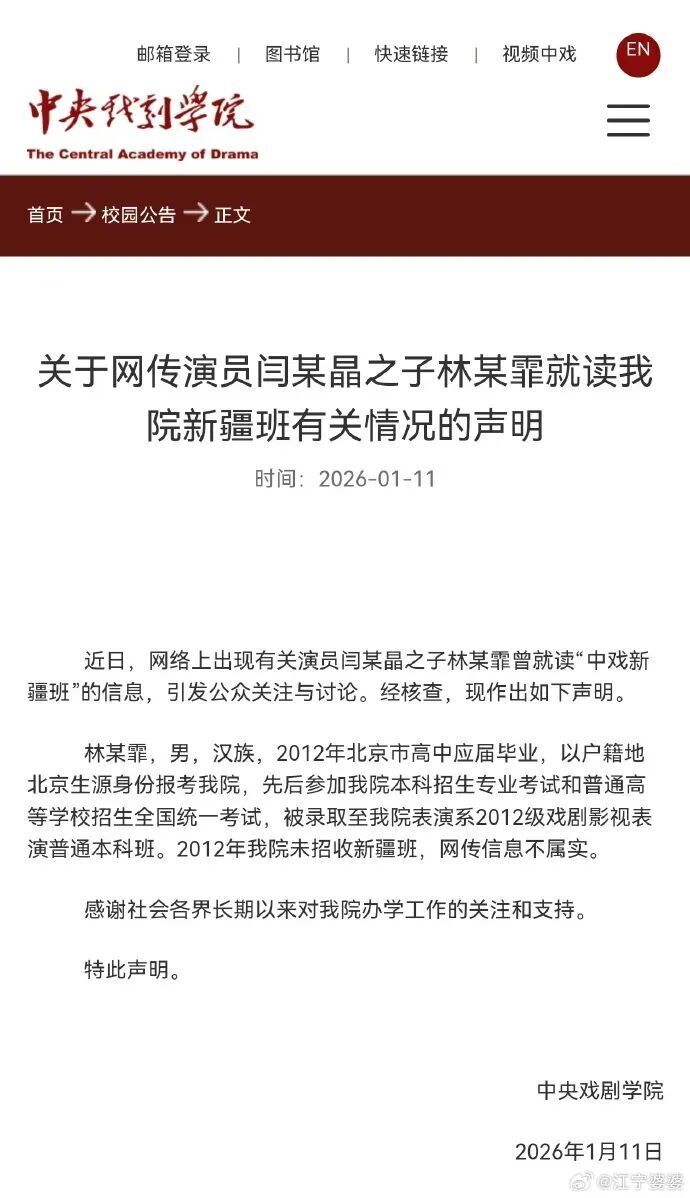 1月11号,中戏也吓得出来回应:她儿子是普通班的,跟新疆班没关系。