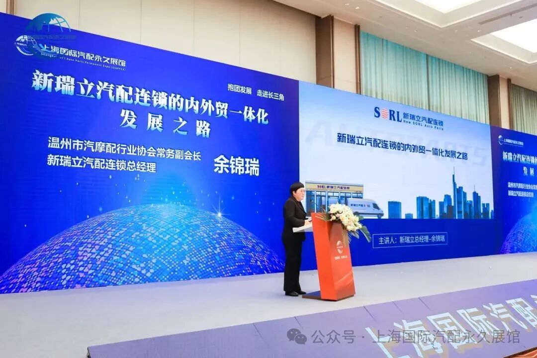 新瑞立汽配连锁总经理余锦瑞分享内外贸一体化发展之路,其“国企+民企”的创新合作模式已合资合作全国104 家国有公交企业,网点遍及全国303 个地市,海外业务拓展至132个国家和地区。余锦瑞表示,新瑞立汽配连锁将从国内国际两个市场为入驻上海国际汽配永久展馆的参展企业全面赋能。