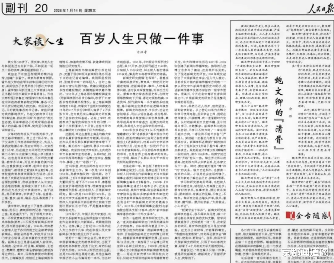 2026年1月14日《人民日报》第20版头条刊载的新闻史学泰斗方汉奇先生的《百岁人生只做一件事》一文,百岁老人回顾了自己治学与人生历程。如沐春风,亦如闻钟鼓。如饥似渴的一口气读完,文中字字皆透着“择一事,终一生”的坚守,句句都藏着“下苦功,成大器”的真谛。掩卷沉思,方先生百岁高龄仍笔耕不辍、求知不怠的身影,在字里行间愈发清晰,也让“下功夫才能出成果”的道理,有了最生动的注脚。