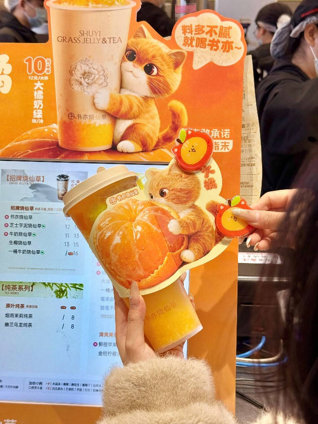 在大橘饮品获得高口碑好评的同时,系列周边配套产品也引发抢购热潮,备受年轻人喜爱,成为网络上的热门话题。其独特的“橘猫”宠物美学包装视觉和可爱小发夹,自带“出片”属性,可爱萌宠形象传递出书亦品牌的陪伴与治愈,将产品融入消费者的生活仪式,打造有温度的消费体验。换句话说,顾客购买的不仅是一杯饮品,也是一份可记录、可分享的“仪式感”,进一步延伸了产品的体验价值。