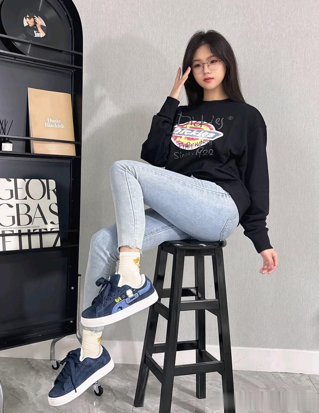 搭配一件黑色上衣,经典的“蓝黑配”永远不会出错。怕冷的话,内搭一件修身的黑色加绒打底衫,外面套一件黑色短款羽绒服或羊羔毛外套,上深下浅的配色,视觉上自带层次感,显瘦又显高。要是天气没那么冷,一件黑色卫衣就够了,宽松的版型慵懒又随性,和浅蓝色牛仔裤一搭,青春感直接溢出屏幕。