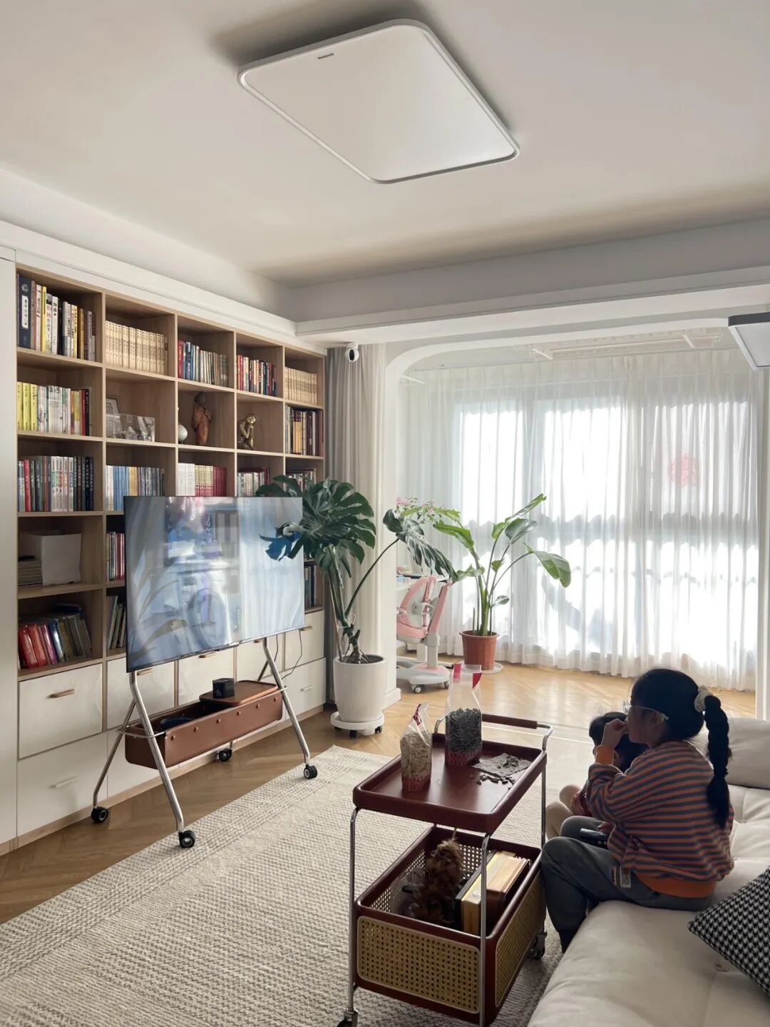 移动电视就是为偶尔看电视星人量身定制的。买个65寸的大电视,直接架在支架上,想看的时候拉到沙发前,或者拉到餐厅边吃饭边看,不想看推到角落,一点都不占地。而且高度还能调,躺着看、坐着看都舒服。