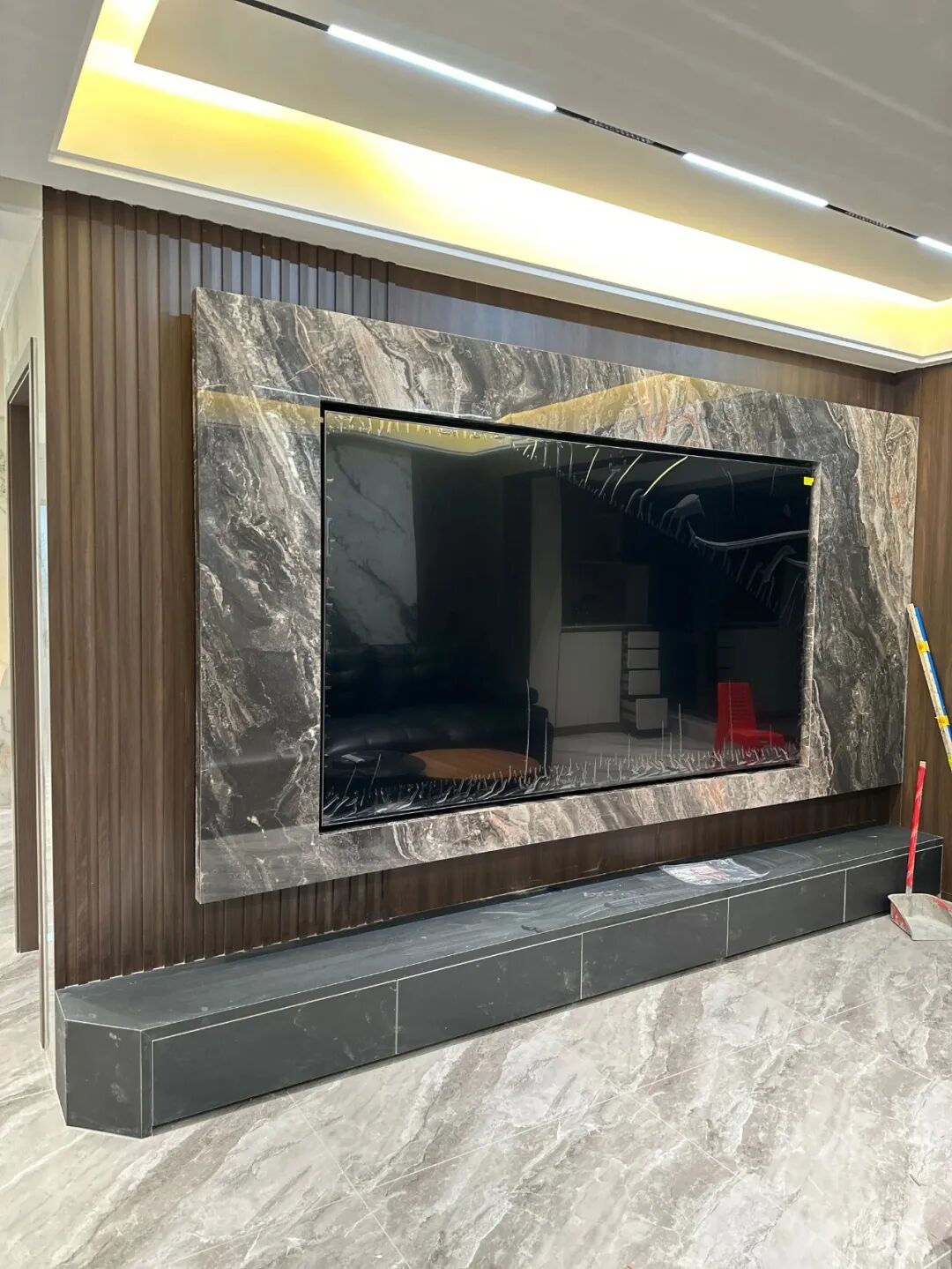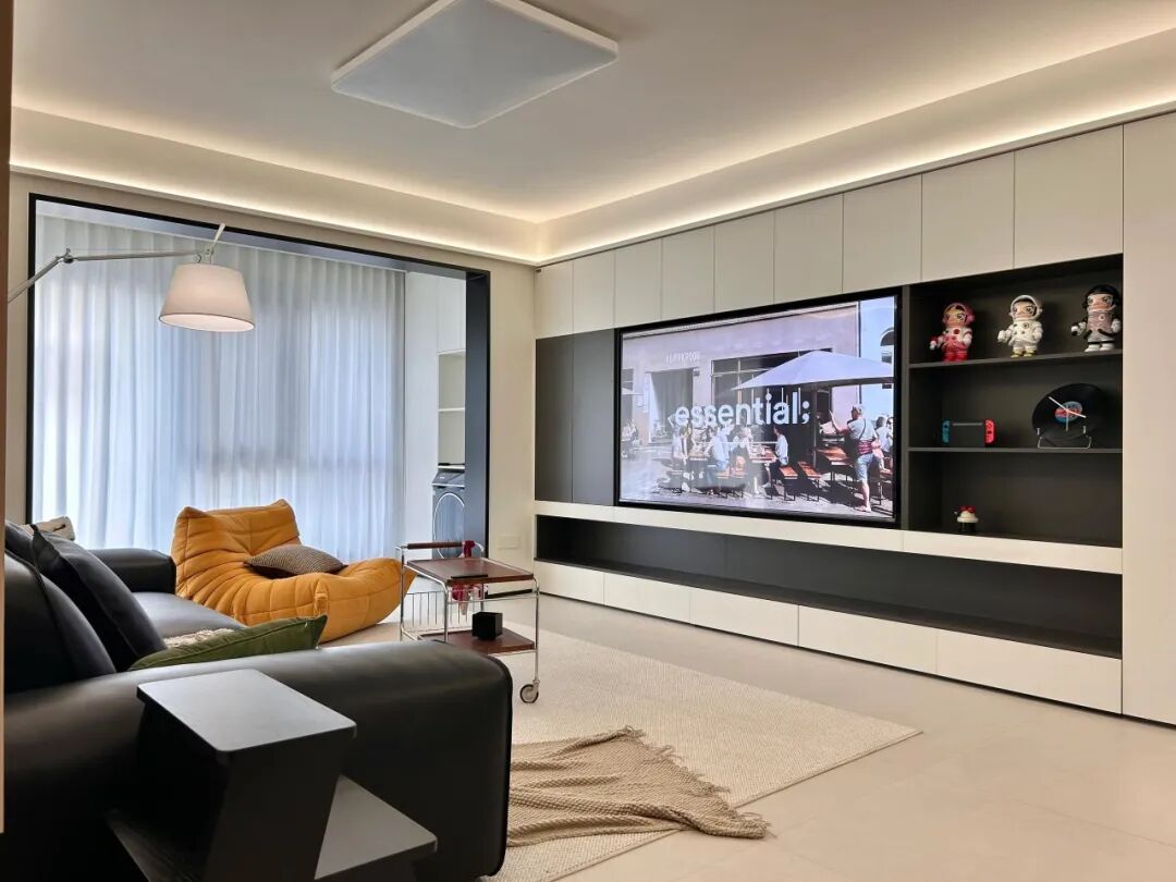 有一个特别聪明的网友,她家直接把整面电视墙打造成了满墙储物柜。中间留个位置放电视或者投影幕布,四周全是收纳柜,里面装家里的杂物、囤货、零食,因为有这整面柜子,整个家住了三年,还像刚搬进来一样整洁。
