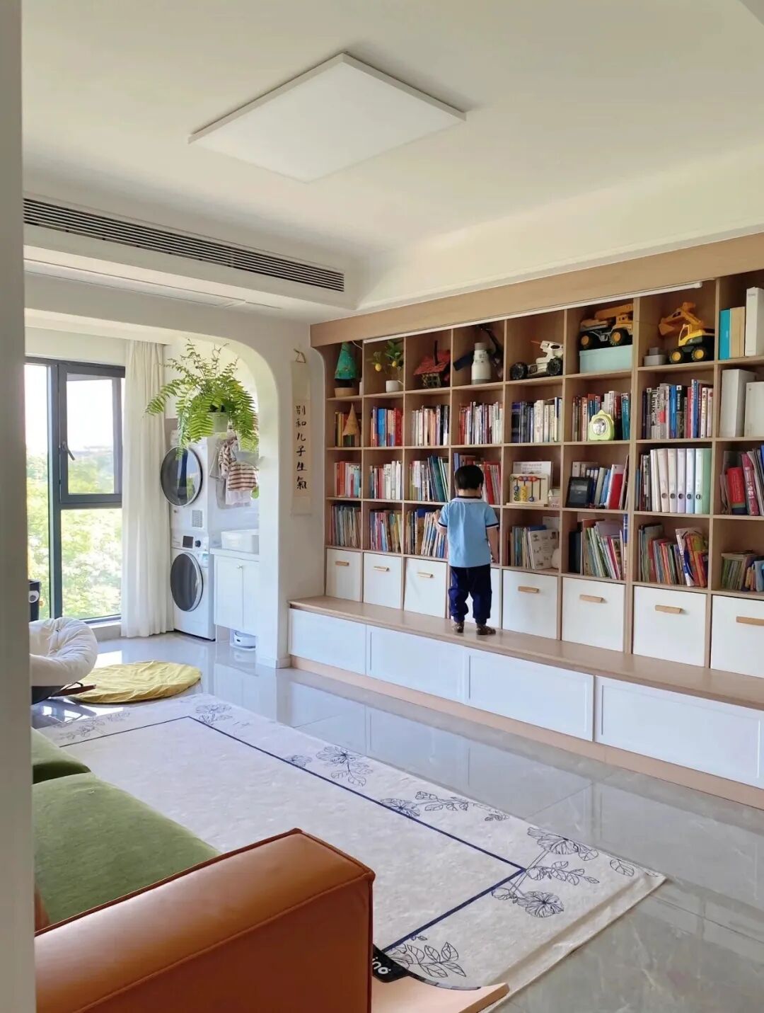 下面放绘本,上面放常看的书,旁边再摆个沙发。客厅瞬间变成了家庭图书馆。孩子放学回来,自然而然地就会拿本书来看,比你吼他一百遍“去看书”都管用。