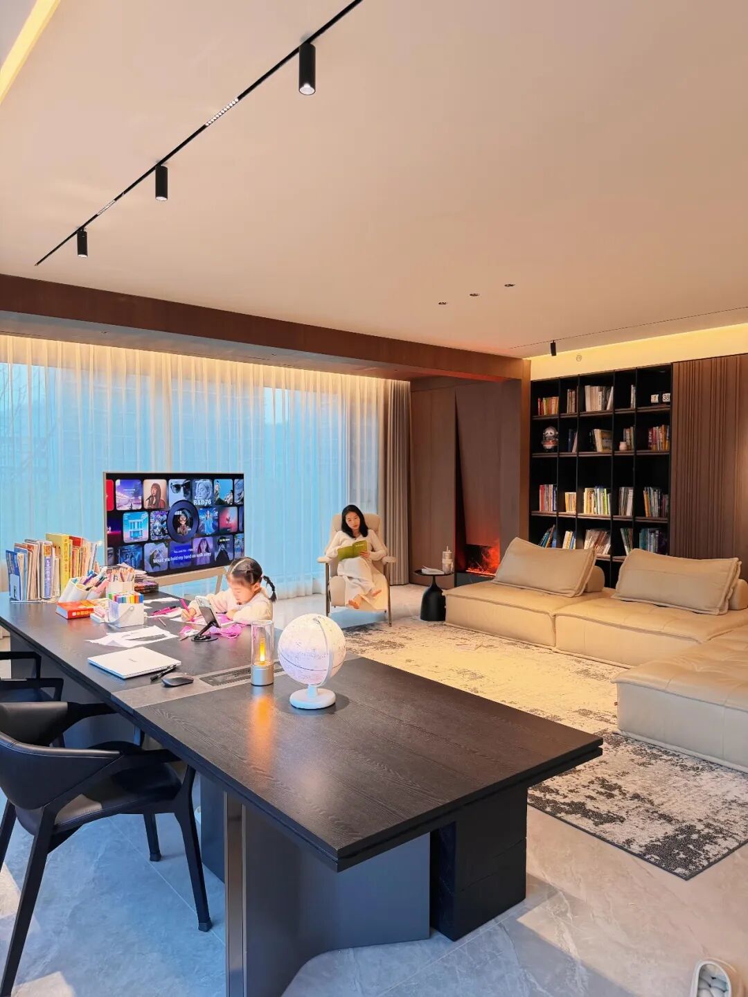 老公在旁边用电脑加班,孩子在对面写作业,你在另一头做手工。一家人各忙各的,但抬头就能看见彼此。