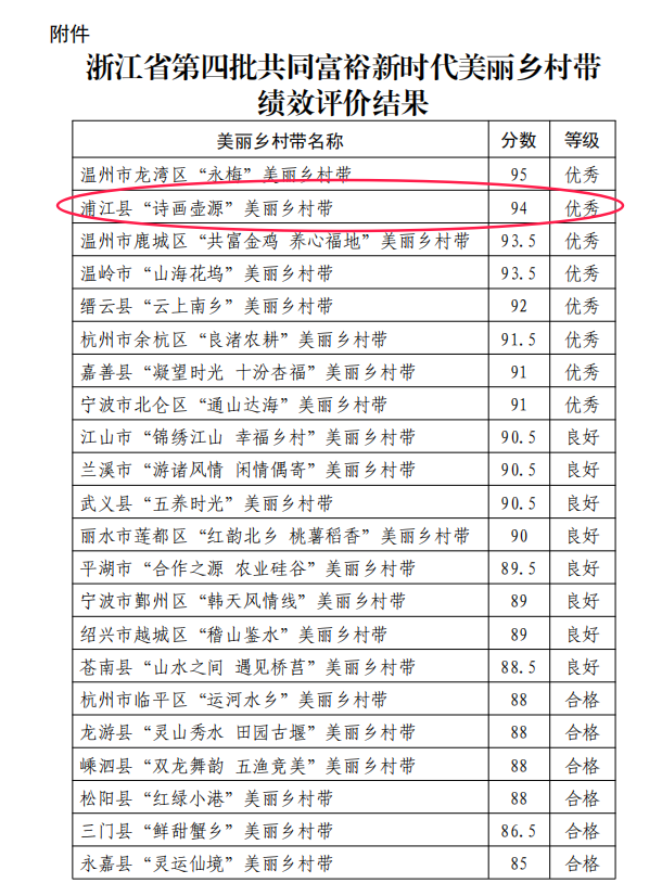 近日,浙江省第四批共同富裕新时代美丽乡村带绩效评价结果公布,我县“诗画壶源”美丽乡村带以全省第二名的成绩,获评优秀等级,成为全省乡村振兴与共同富裕融合发展的标杆案例。