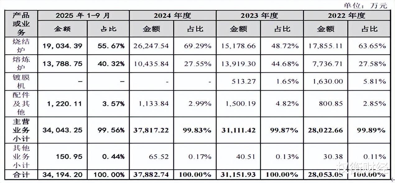 报告期内,公司主营业务收入主要包括烧结炉、熔炼炉、镀膜机等,各报告期主营业务收入分别为2.802亿元、3.111亿元、3.782亿元和3.404亿元,占营业收入的比重分别为99.89%、99.87%、99.83%和99.56%。