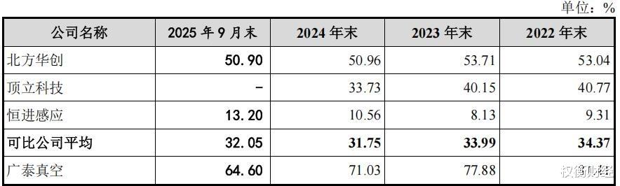 广泰真空实控人控股超8成,64年生高中学历;2024年增收反降利,毛利率波动且低于可比同行均值;前五大客户占比四成,存货余额较大;研发费用率低于可比同行均值,大额合同负债余额推高资产负债率。