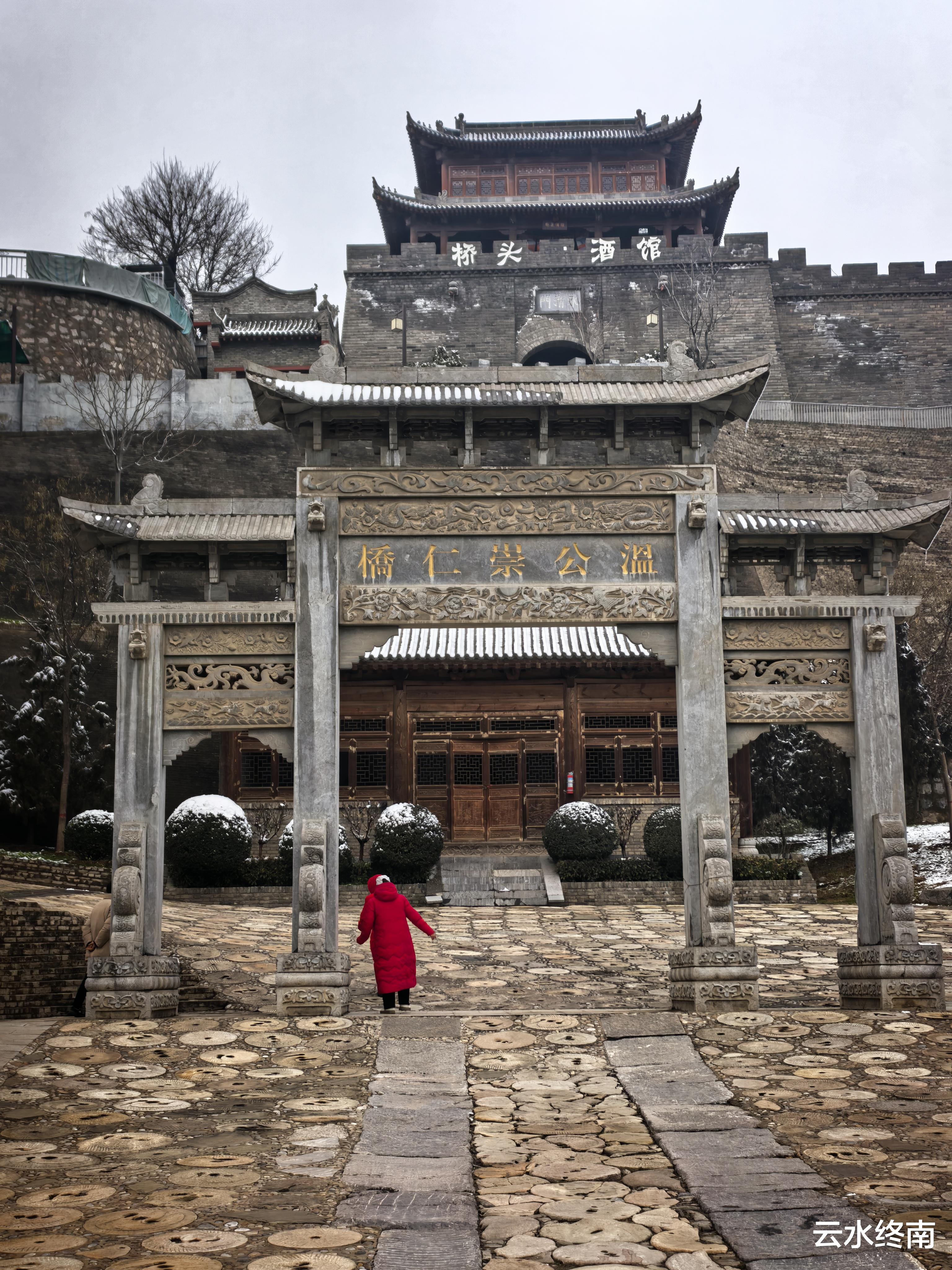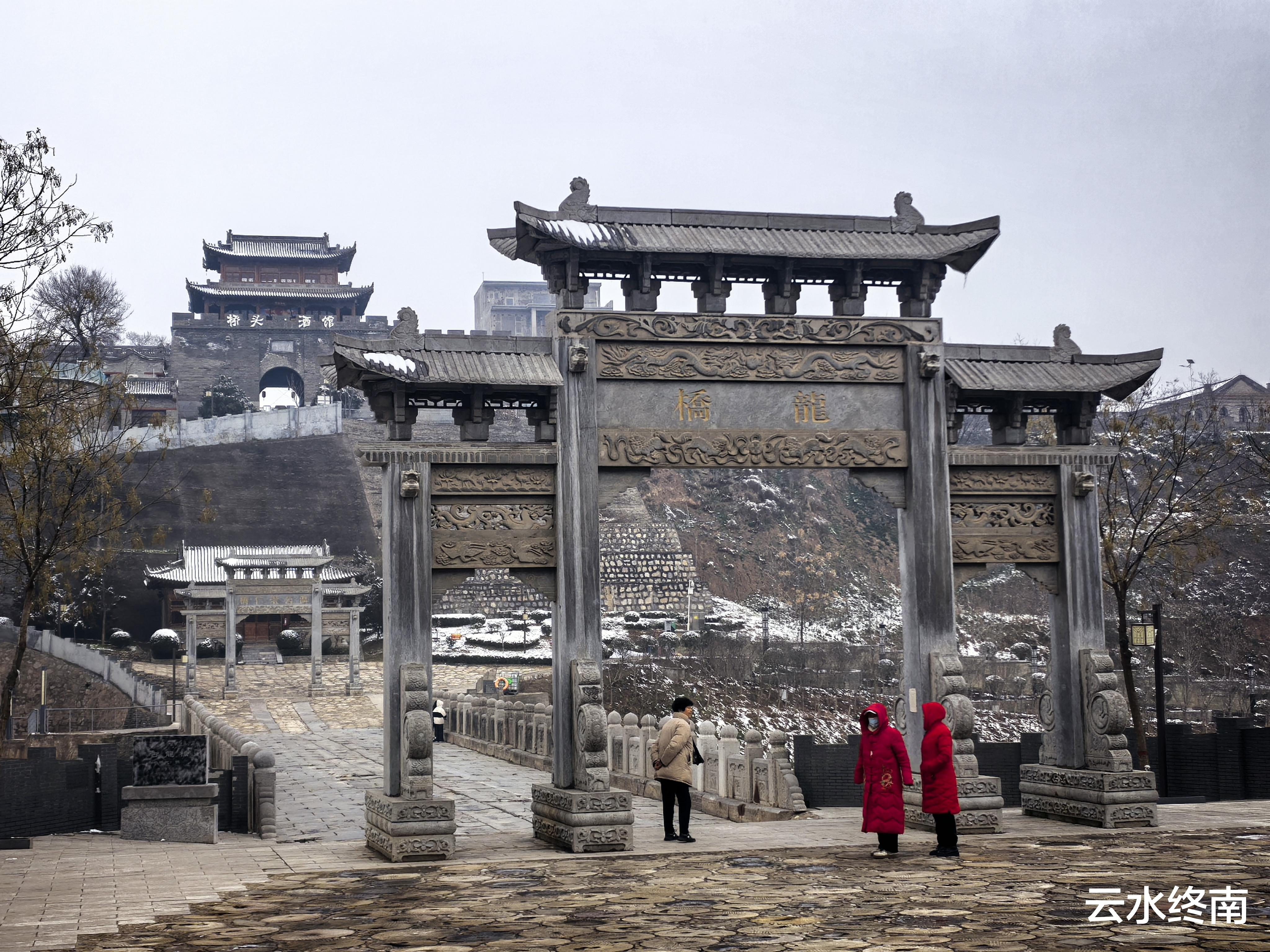 下到桥上,就看到两边的石雕牌坊。牌坊是新建的,这倒是没有什么问题,描龙刻凤的看着挺花哨,但是怎么看,怎么怪怪的。