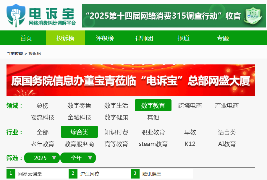 根据“电诉宝”2025年受理的综合教育领域用户有效投诉显示,入选投诉榜的依次为网易云课堂、沪江网校、腾讯课堂。此前,有道精品课、开课吧等综合教育平台也遭遇过类似投诉。(更多投诉榜详见:电诉宝)
