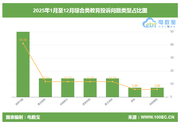 据“电数宝”监测数据显示,2025年全国综合类教育用户投诉问题类型主要包括退款问题(41.18%)、售后服务(11.77%)、网络欺诈(11.77%)、虚假促销(11.77%)、霸王条款(11.77%)、其他(5.88%)、网络售假(5.88%)等。