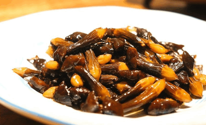 来源:食悟者(百家号)     用料为鸡枞、去皮田鸡腿等。    制作时,鸡枞改成滚刀块;灯笼辣切成马眼片;葱斜刀切成厚片。田鸡腿洗净改成坨盛入碗内,加盐、味精、胡椒粉、蚕豆水粉和黄酒腌15分钟待用。     锅上火下油,待油烧至四成热时,分别将鸡枞、田鸡下锅过油后倒入漏勺中。锅留底油,依次将灯笼辣、葱头入锅煸香,再将鸡枞下入,加盐、味精、胡椒粉和甜咸酱油、甜酒汁拌匀,将田鸡坨倒入,勾茨淋油拌匀即可。    【鸡枞菇滑鸡片】
