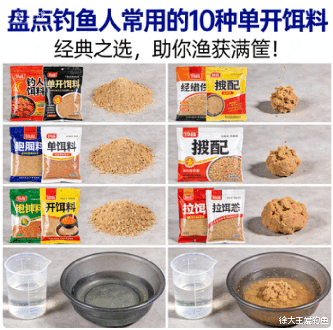 最后补充几个单开饵料的避坑提醒:一是不要忽略加水比例,每种饵料的包装上都有推荐加水比例,新手严格按照推荐比例来,宁少勿多,加水过多可少量补加饵料,加水过少则无法形成稳定状态;二是不要过度揉打饵料,大多数单开饵料揉打次数过多会变得僵硬,影响雾化和附钩性,一般揉打2-3次即可;三是根据季节调整状态,冬季低温时,饵料可稍软一点,方便鱼吸食;夏季高温时,饵料可稍硬一点,减少雾化过快导致的小杂鱼闹窝;四是不要盲目追求“贵的就是好的”,这10种经典单开饵料性价比都很高,效果经过实战验证,新手不用跟风买高价饵料。其实单开饵料的核心就是“精准适配”,根据目标鱼种和作钓场景选对味型,再掌握简单的开饵技巧,就能轻松提升渔获。最后想问问大家,你平时最常用哪种单开饵料?有没有用单开饵料爆护的经历?欢迎在评论区分享你的使用技巧,帮更多新手避开饵料的坑!