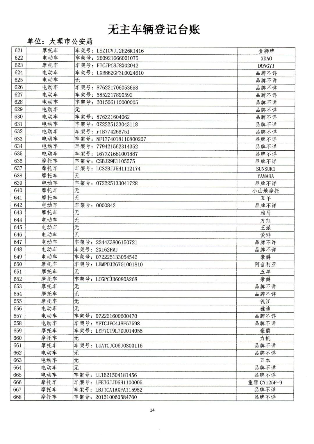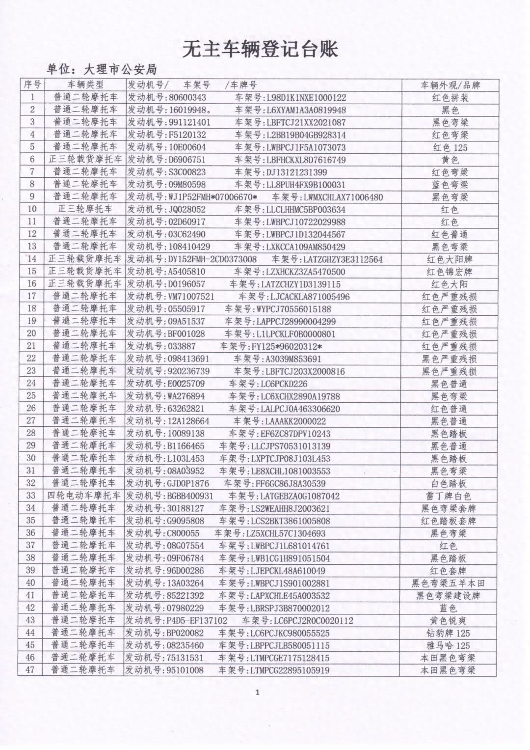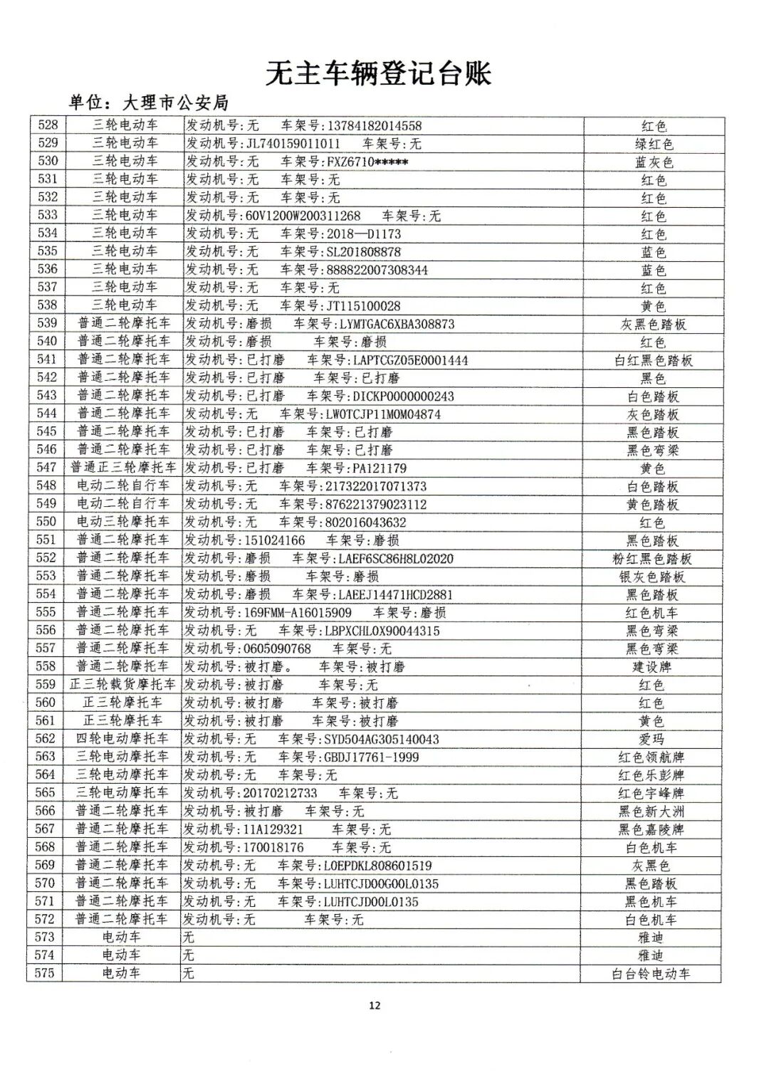 近年来,大理市公安局在开展“两抢一盗”和“道路交通”专项整治及日常执法办案工作中依法扣留761辆无主机动车、非机动车(详见附件),经公安机关多方核查,至今无法查清车辆权利人,无人认领。根据《中华人民共和国道路交通安全法》及相关法律法规规定,现面向社会发出认领公告,将车辆信息予以公示。