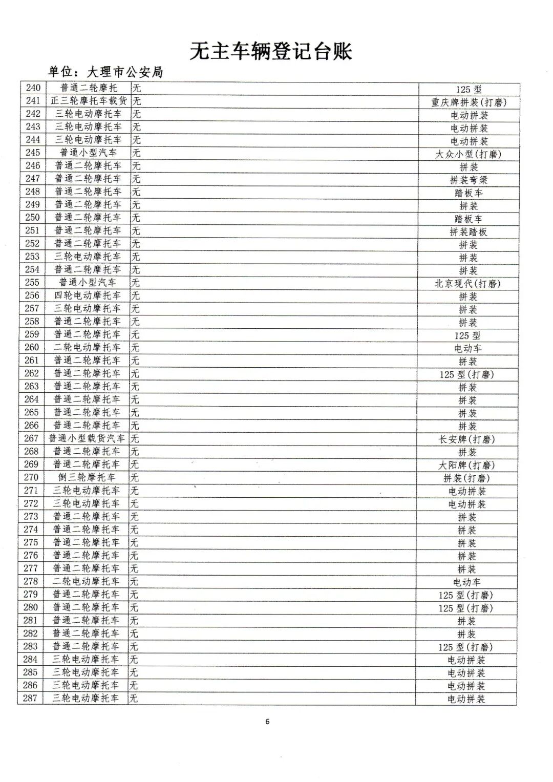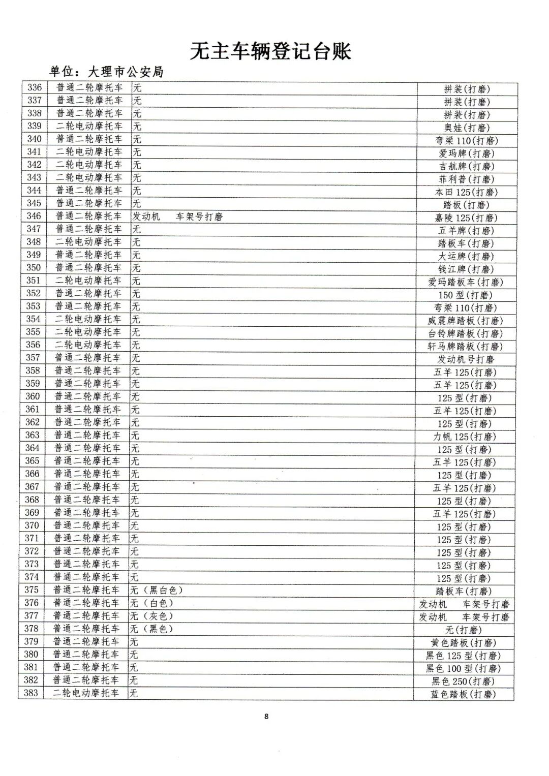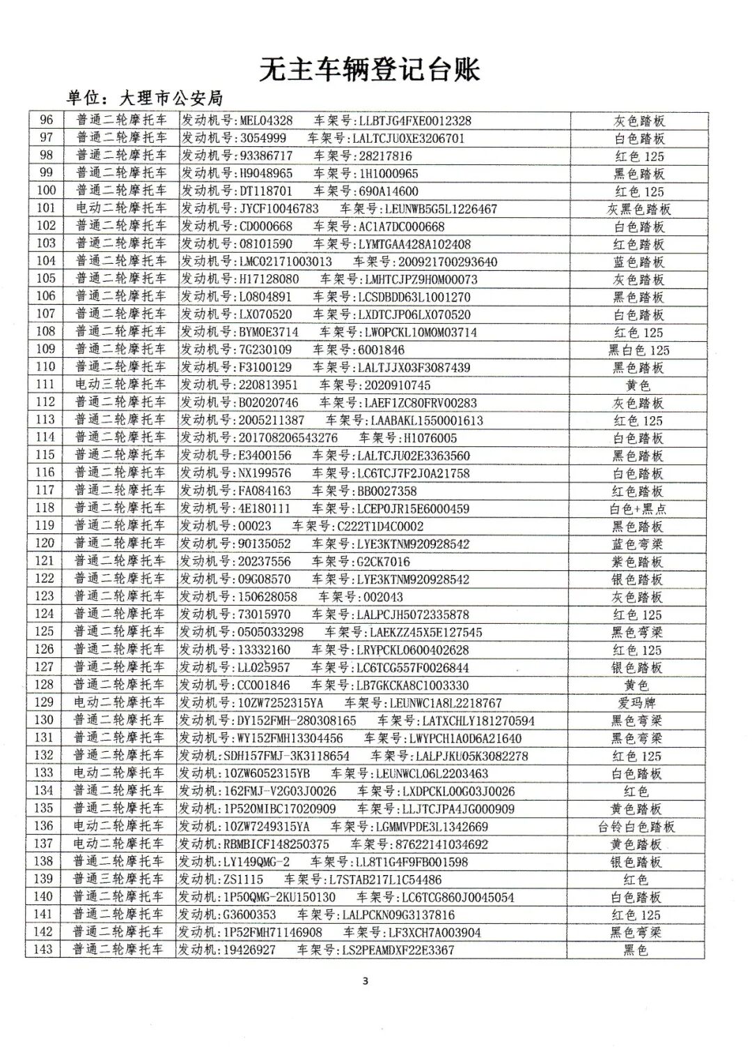 近年来,大理市公安局在开展“两抢一盗”和“道路交通”专项整治及日常执法办案工作中依法扣留761辆无主机动车、非机动车(详见附件),经公安机关多方核查,至今无法查清车辆权利人,无人认领。根据《中华人民共和国道路交通安全法》及相关法律法规规定,现面向社会发出认领公告,将车辆信息予以公示。