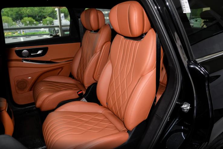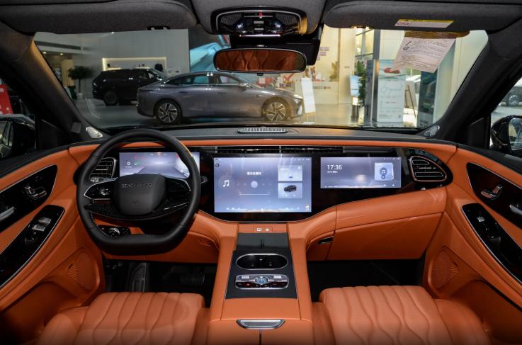 打开车门,我们看到中控区域是常见的环抱式座舱布局,T字型中控台采用大面积软包面料包覆,细密的缝线沿门板、中控区域修饰,丰富了座舱内部的层次感。除此之外,前排还能看到大面积的钢琴烤漆和镀铬元素装饰,中央区域保留实体物理按键,方向盘采用触控设计,配合中控区域三联屏来看,视觉效果档次感十足,但也因此存在“指纹”不易清理的问题。车机适配骁龙8155芯片,对于这个价位的车型来说,车机硬件算力中规中矩,且系统不支持应用生态的接入,所以一些热门车机软件无法下载安装使用,可玩性相对受限。