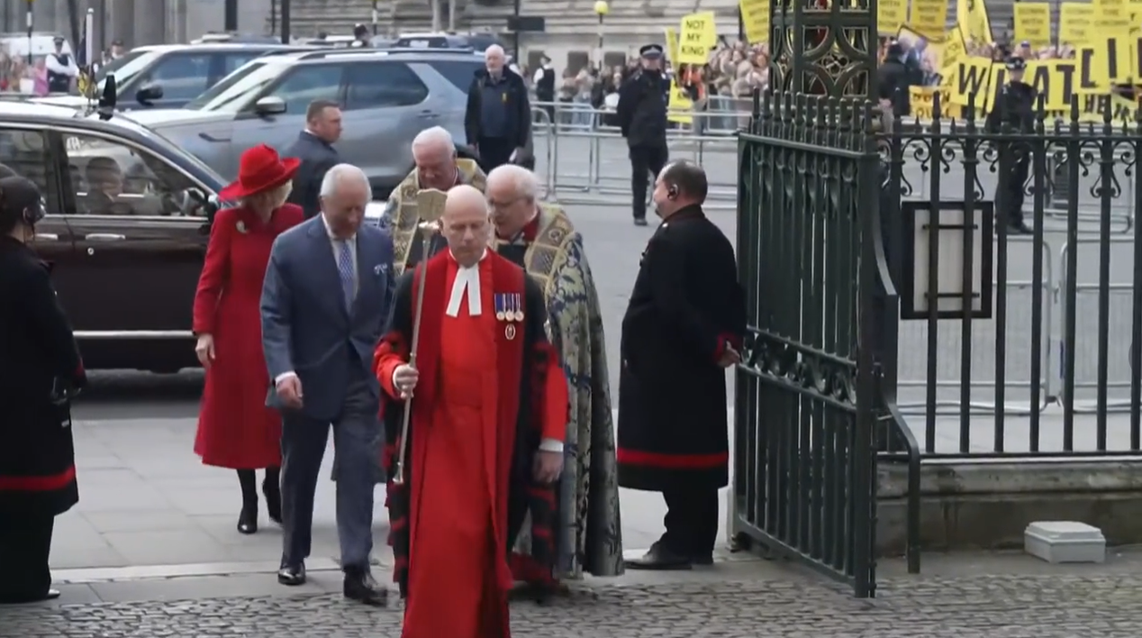 从媒体晒出的照来看,英国国王的车队抵达教堂门口,大主教亲自到门口迎接,可见国王与王后的身份尊贵,还有一个穿着红色袍子在前面引路,手里还拿着东西,应该是教堂专用的物品。