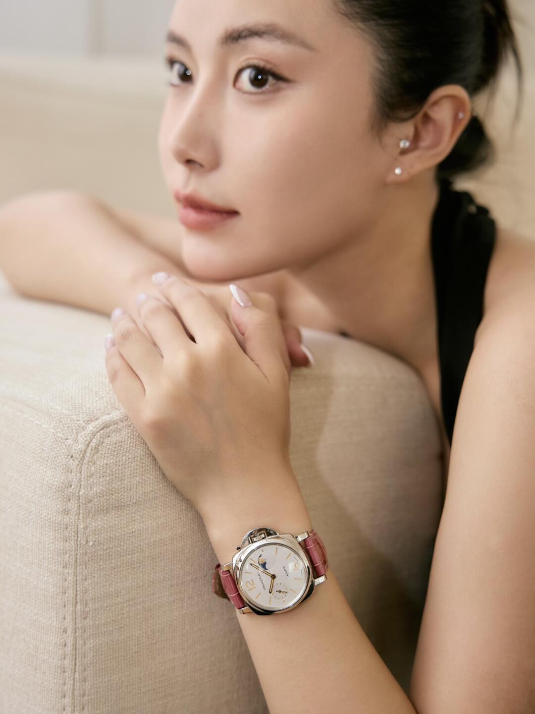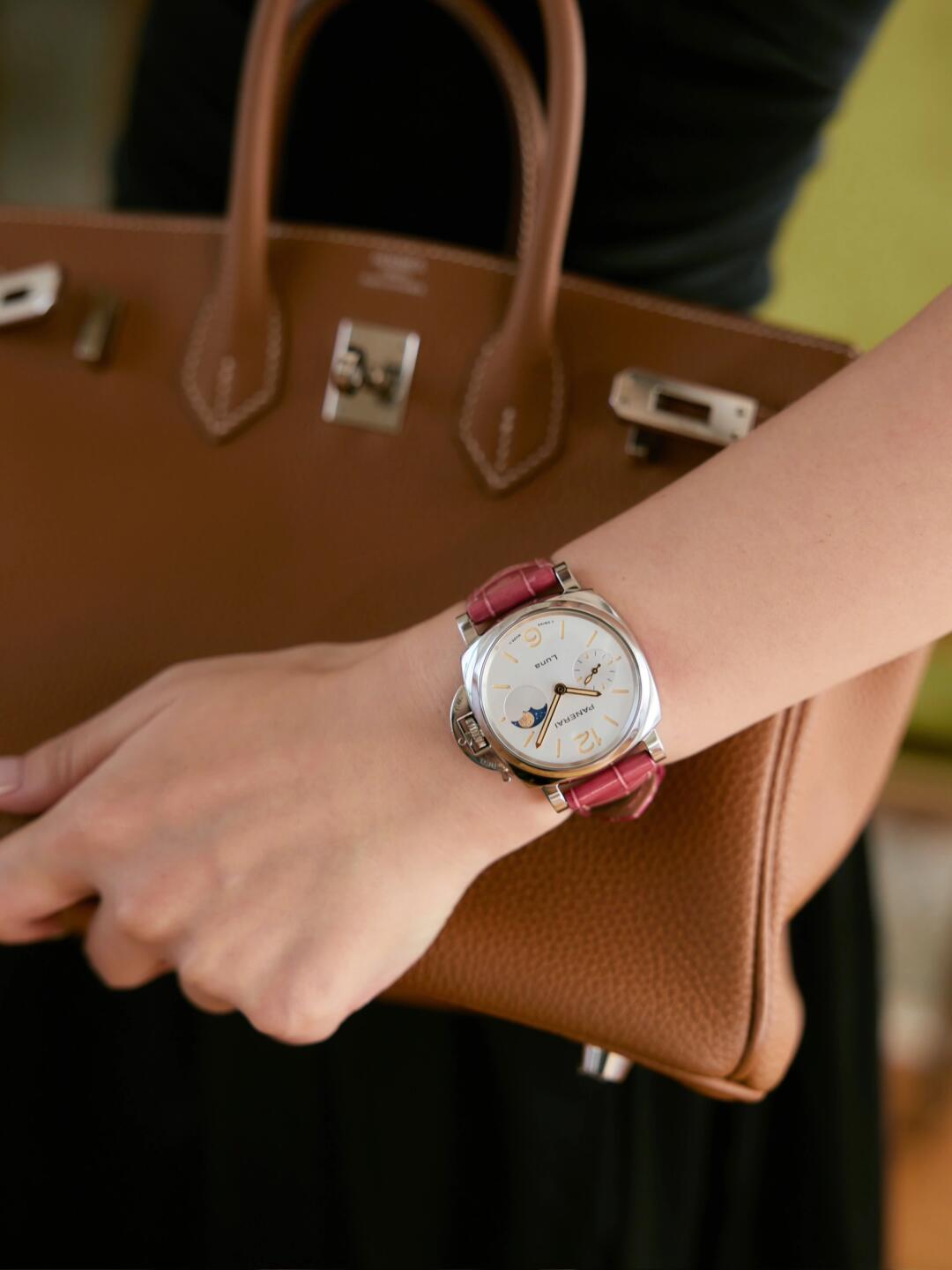 38mm的白色表盘搭配深粉色鳄鱼皮表带