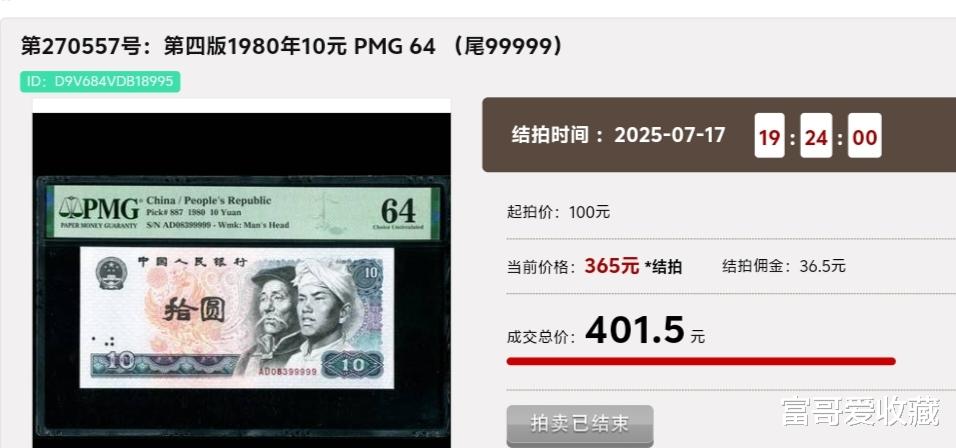 在2025年7月17日的“钱币拍卖会”中,就有一张1980年的“10元纸币”,数字号码尾数为(99999),也称之为“五同号”或者“老虎号”。