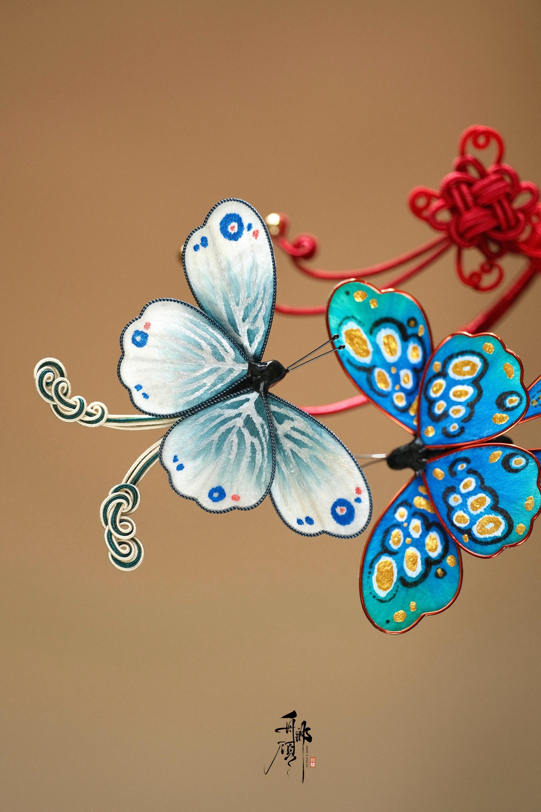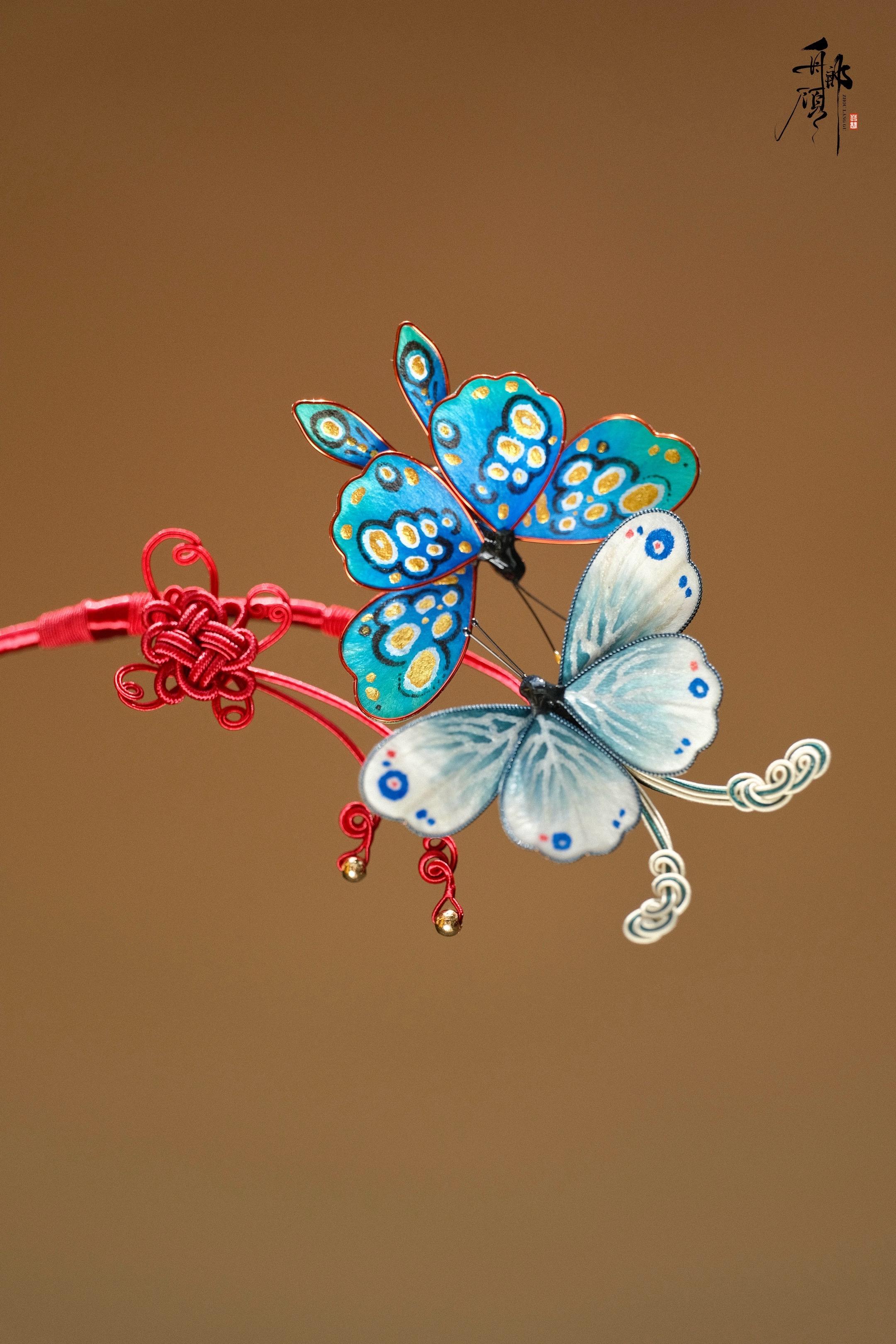 结构基础,细节就不基础。用绕花丝作蝴蝶燕尾,构图参考了「弘历雪景行乐图」里的手持蝴蝶。