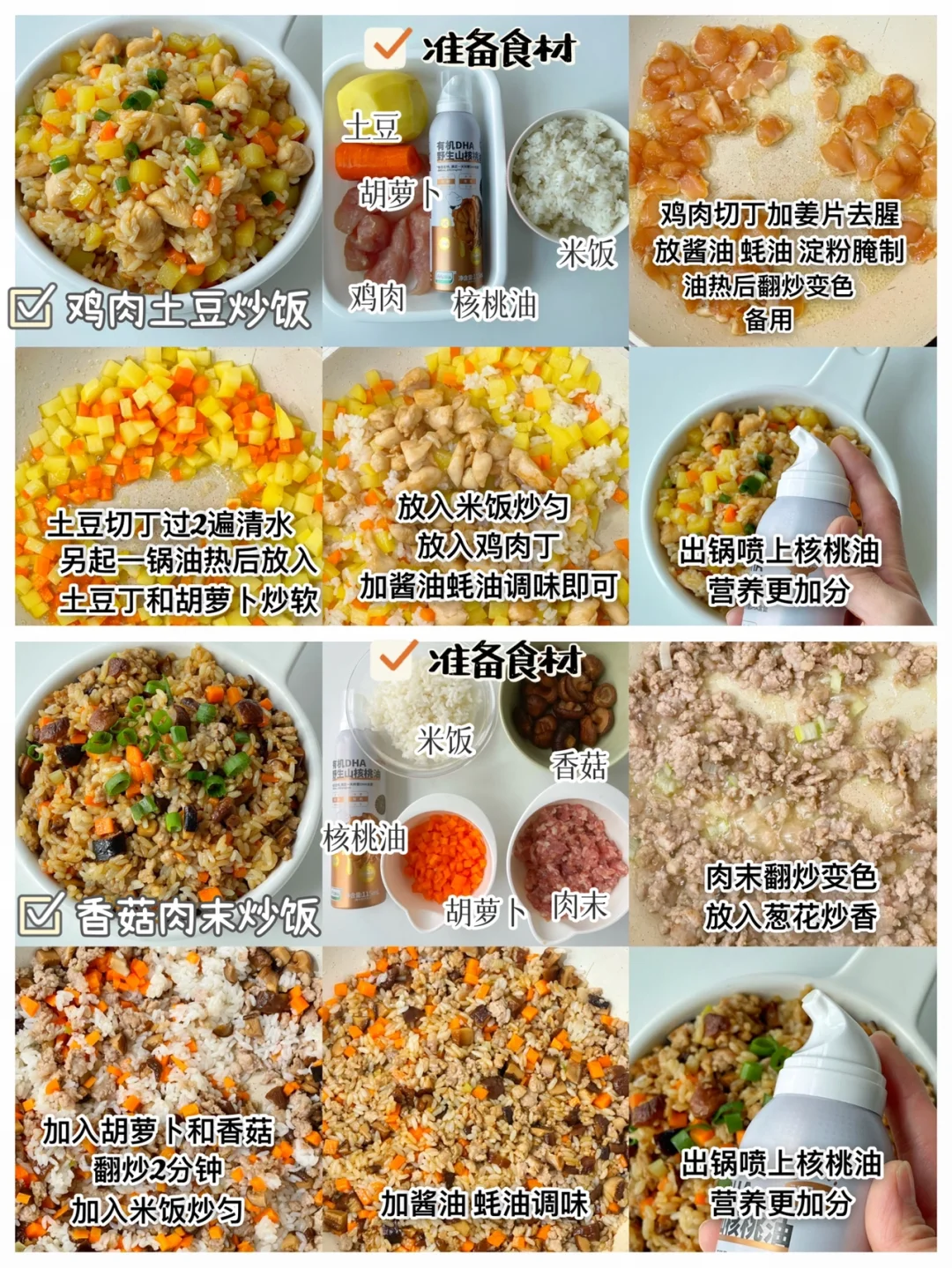✅香菇肉末炒饭:肉末、香菇、胡萝卜、 核桃油、米饭