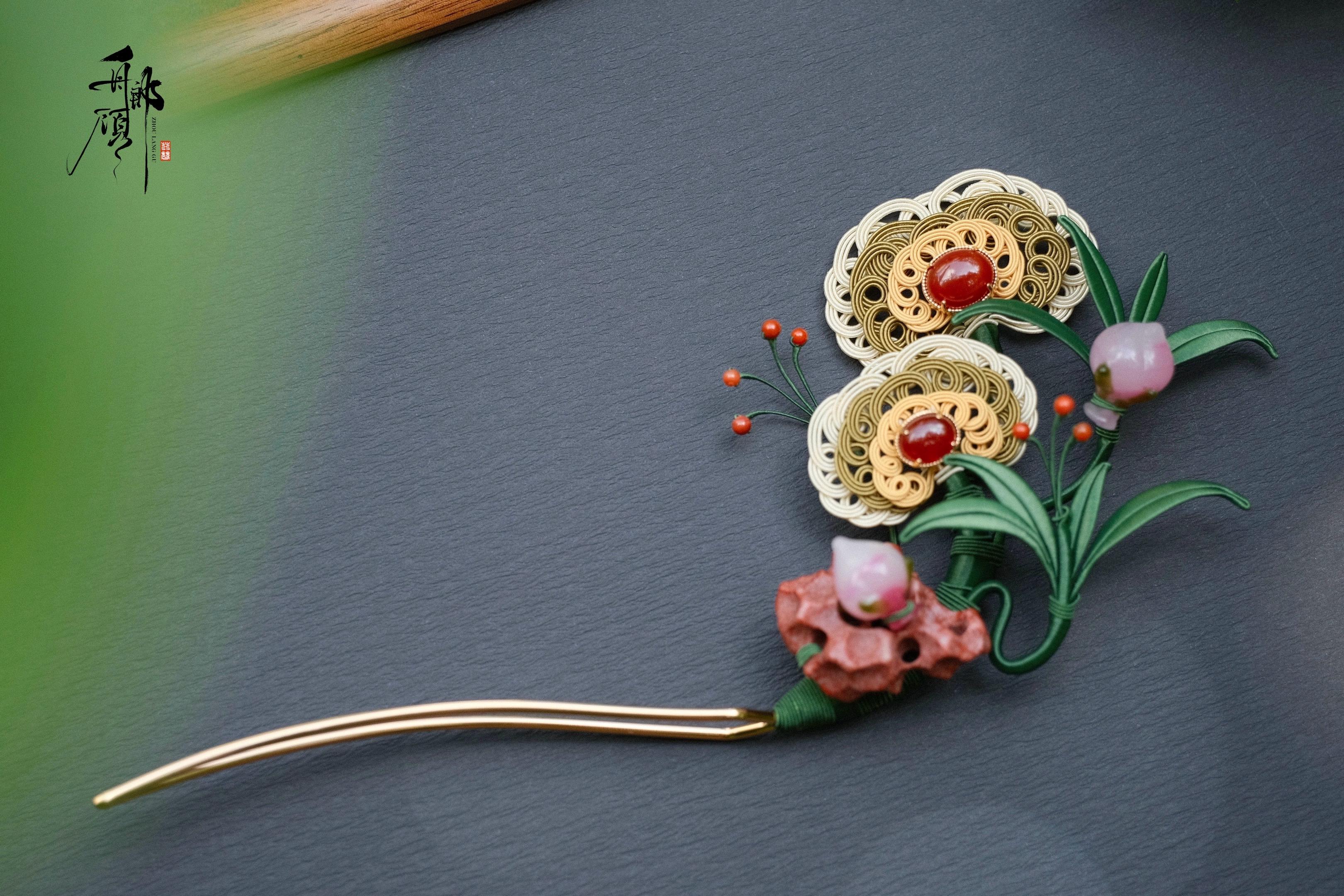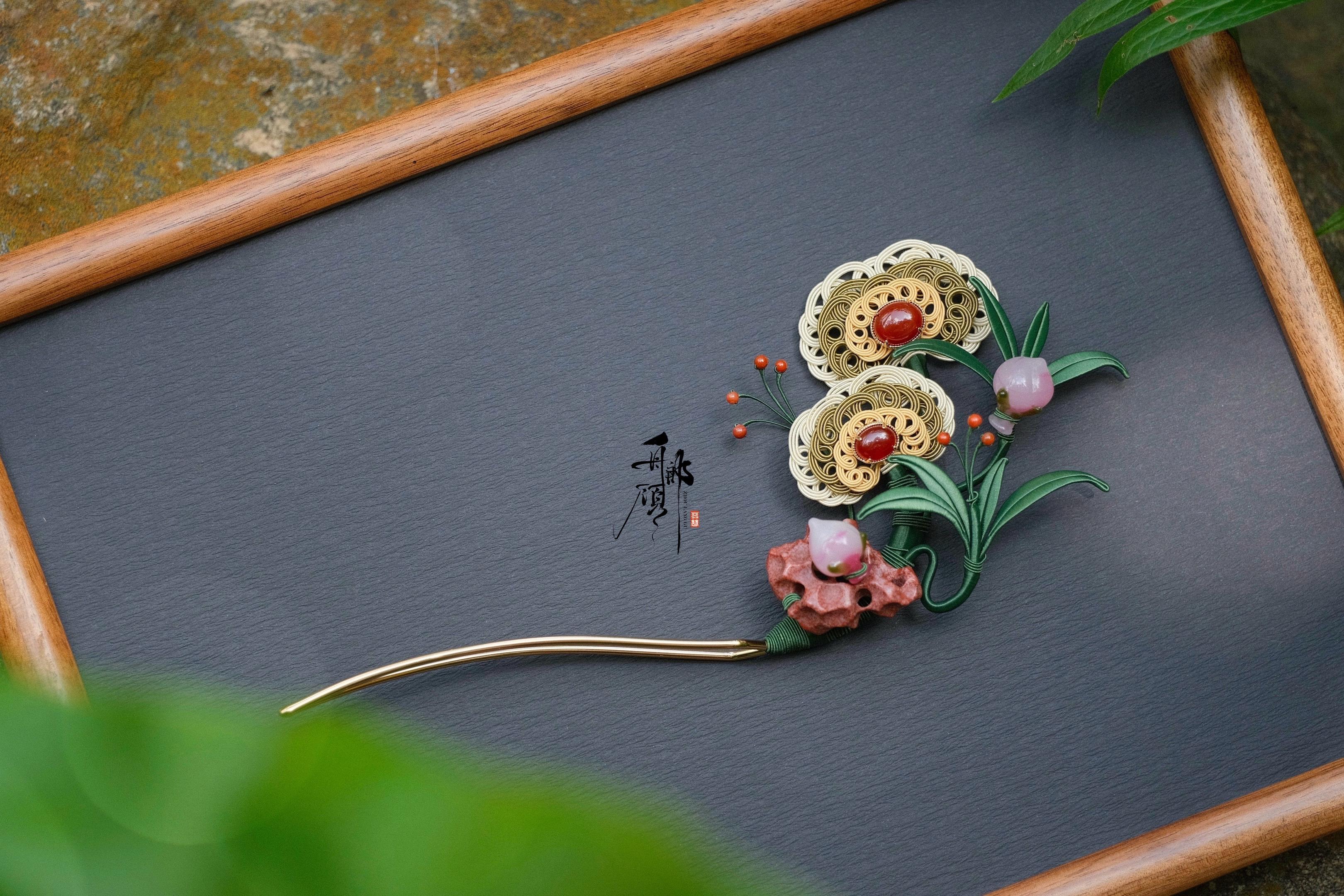 「 石卧芝云桃自仙 」。一支簪子融合了奇石、灵芝、翠竹、仙桃, 都是我爱的元素。