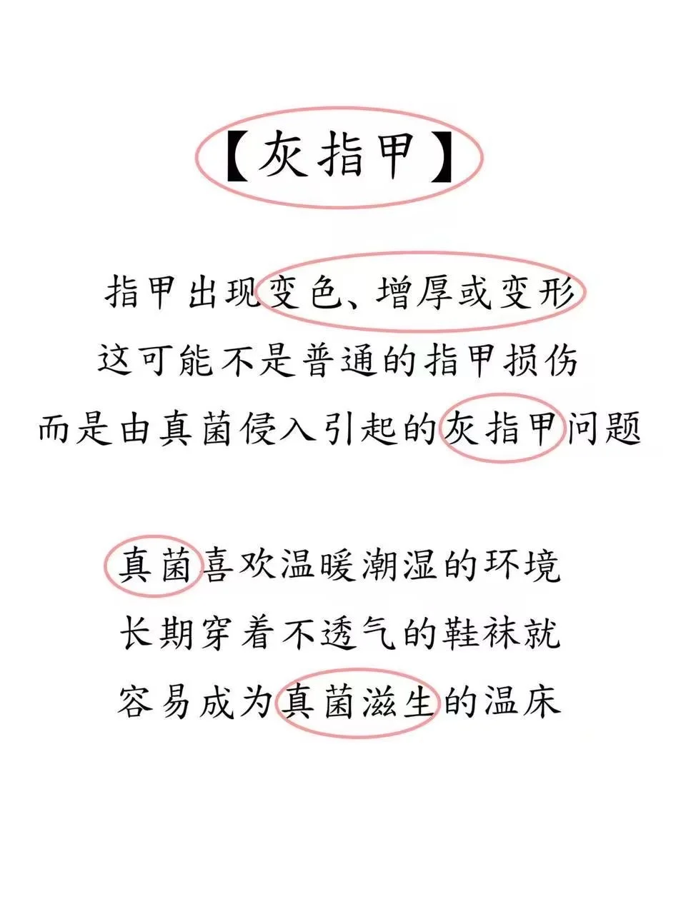指甲出现变色、增厚或变形。这可能不是普通的指甲损伤,而是由真菌侵入引起的灰指甲问题。真菌喜欢温暖潮湿的环境,长期穿着不透气的鞋袜就容易成为真菌滋生的温床。