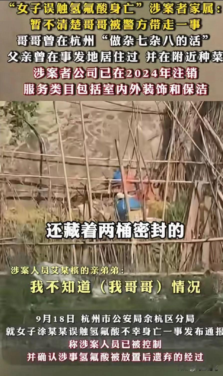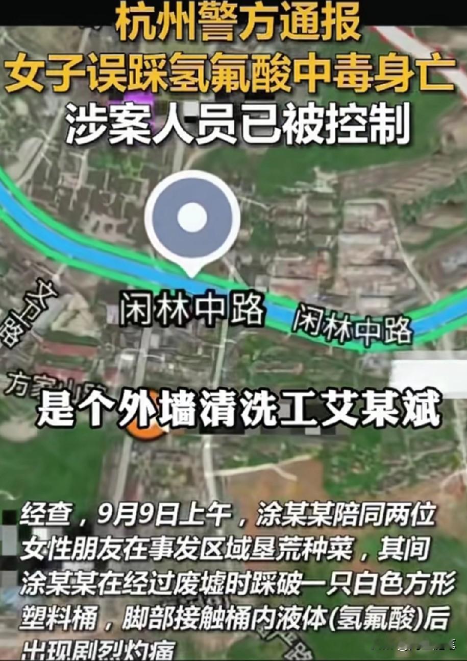 杭州涂大姐火化之际,警方已锁定 “化骨水”这一致命元凶,真凶并非 歹徒,而是外墙清洗工艾某冰。 10年前,艾某冰将三桶氢氟酸随意 丢弃在居民种菜的区域。公安通报 证实,2015年他搬离时,不仅遗弃 了这些剧毒物品,连父亲艾某发也 未妥善安置,实在令人难以置信。 氢氟酸具有剧毒,却被装在普通塑 料桶里,在废墟中搁置了整整10 年。期间,地块经历拆迁,邻居也 换了一批又一批。 直至9月9日,涂大姐不慎踩破了装 氢氟酸的塑料桶,氟离子迅速夺走 了她血液中的钙质。短短6小时 后,涂大姐心脏骤停,经过三天全 力抢救,最终人财两空,30万医药 费花光,人还是没留住。 更令人气愤的是,这些氢氟酸是艾 某冰当年清洗玻璃时使用的。现场 还藏有两桶密封的氢氟酸,就放在 居民日常通行的道路旁。该地块在 2024年3月完成拆迁,但围挡破损 了大半年都无人维修,直到9月10 日发生人命案后,才有人来修补围 挡并派人看守。 律师表示,此案未过10年追诉期。 根据法律规定,危险物品肇事罪若 后果严重,最高可判处7年有期徒 刑。此前江西有案例,有人仅泼出 少量氢氟酸就被判了3年,而艾某 冰遗弃三桶氢氟酸并致死人命,量 刑引发关注。目前,艾某冰已被抓 获,案件正在调查中。 此事最该追问的是:拆迁地块为何 成了无人监管的“真空地带”?尽管 警方组织700人排查了285个地方, 未再发现其他危险品,但涂大姐的 丈夫一句“30万砸进去了,人还是 没了,要钱有啥用”,戳中了无数人 的心。 这起悲剧远未结束,三桶氢氟酸撕 开了公共安全管理的大漏洞。公众 期待的不仅是依法严惩凶手,更希 望每一桶剧毒物品都能有可追溯的 管理机制,避免“十年凶器”潜藏在 居民区旁。 在此也提醒大家,下次路过废墟等 危险区域时务必提高警惕,你的一 份小心或许能保住全家人的安全。 点赞关注,共同关注公共安全问题。氢氟酸 化骨水 夺命化骨水