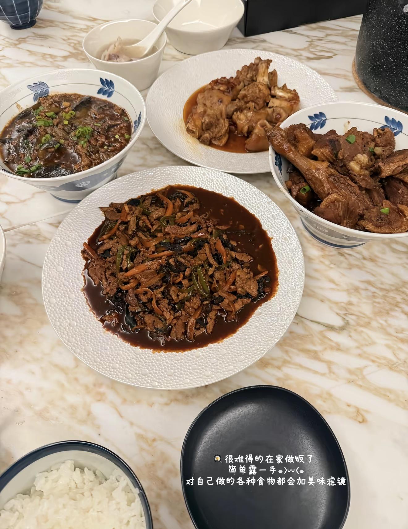 两个人做了四个菜,虽然看起来没有外边餐厅里那般精致,但这红烧的几个菜也是有滋有味。懒懒很谦虚地表示对自己做的各种食物都会加“美味滤镜”。