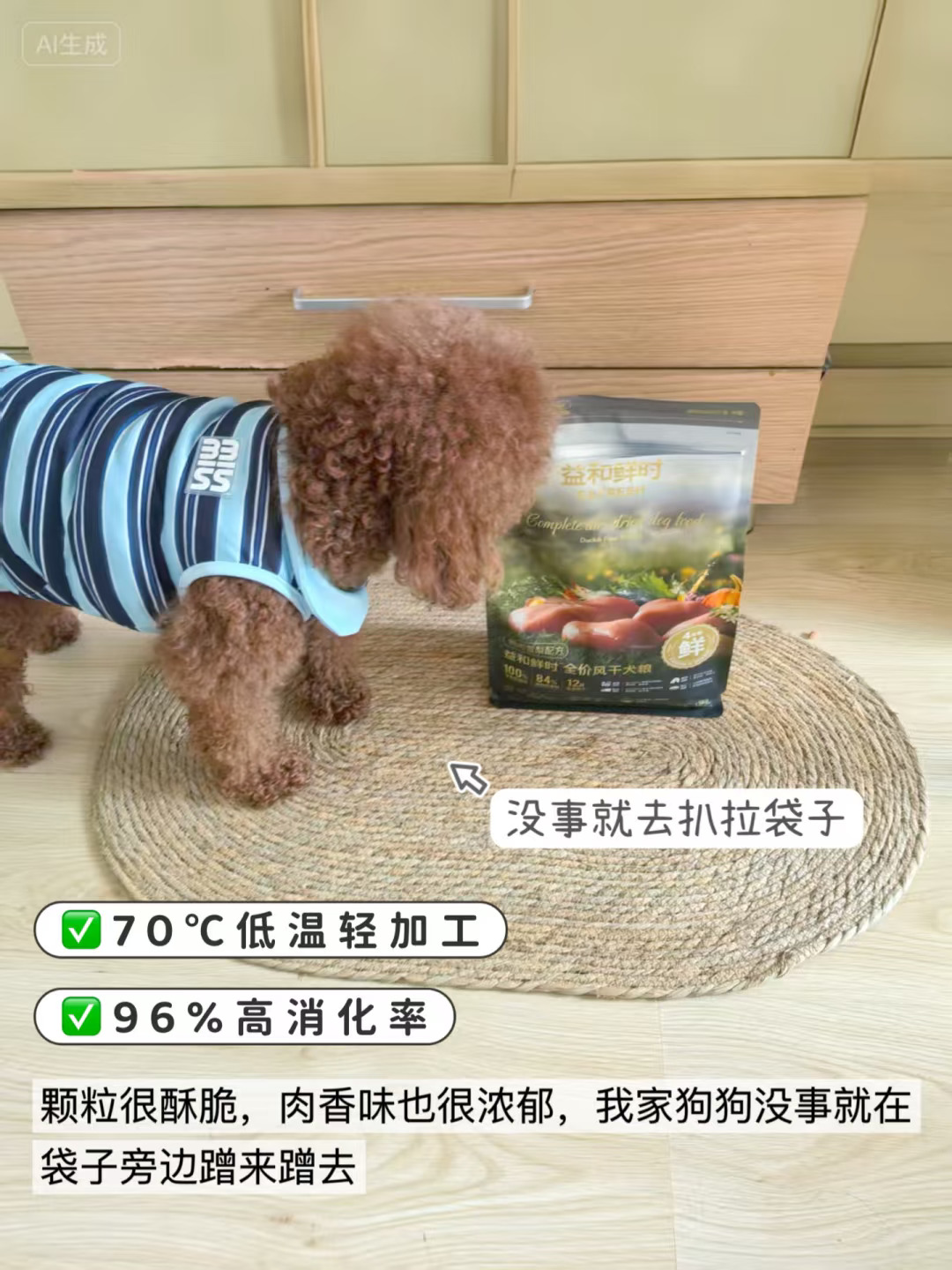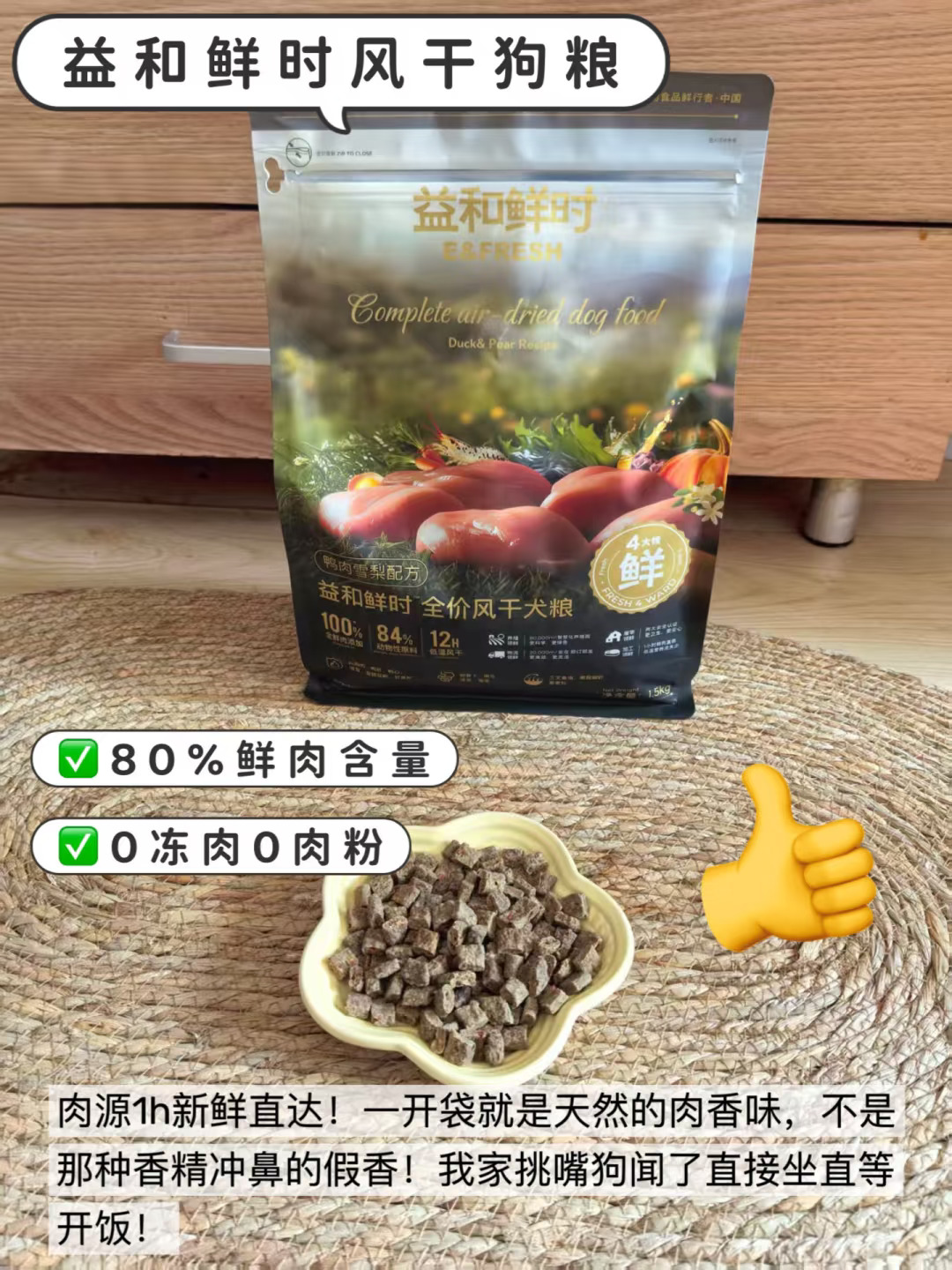 听大家说风干狗粮的适口性会好很多,我就买了益和鲜时风干狗粮!没想到它真的挺爱吃的,现在每天开饭,狗子直接表演饿狼扑食!