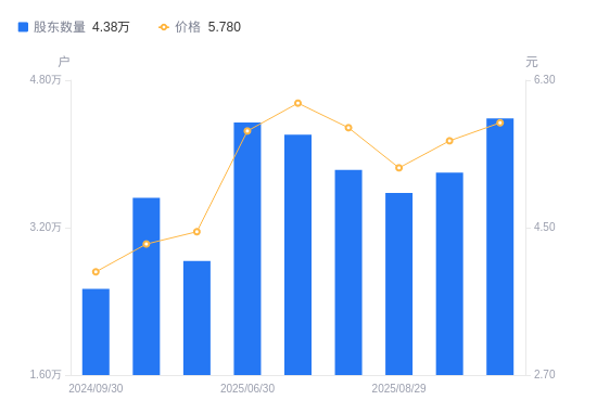 日期A股户数(户)流通A股户均持股数(股)户均持股市值(万元)2025-09-194384415437.318.922025-09-103798417818.919.912025-08-293577218920.769.902025-08-203827317684.3610.122025-08-084209816077.579.682025-06-304340215594.528.862025-03-312837723851.4810.612024-12-313522619214.038.262024-09-302535226697.4310.572024-06-302575227182.359.98