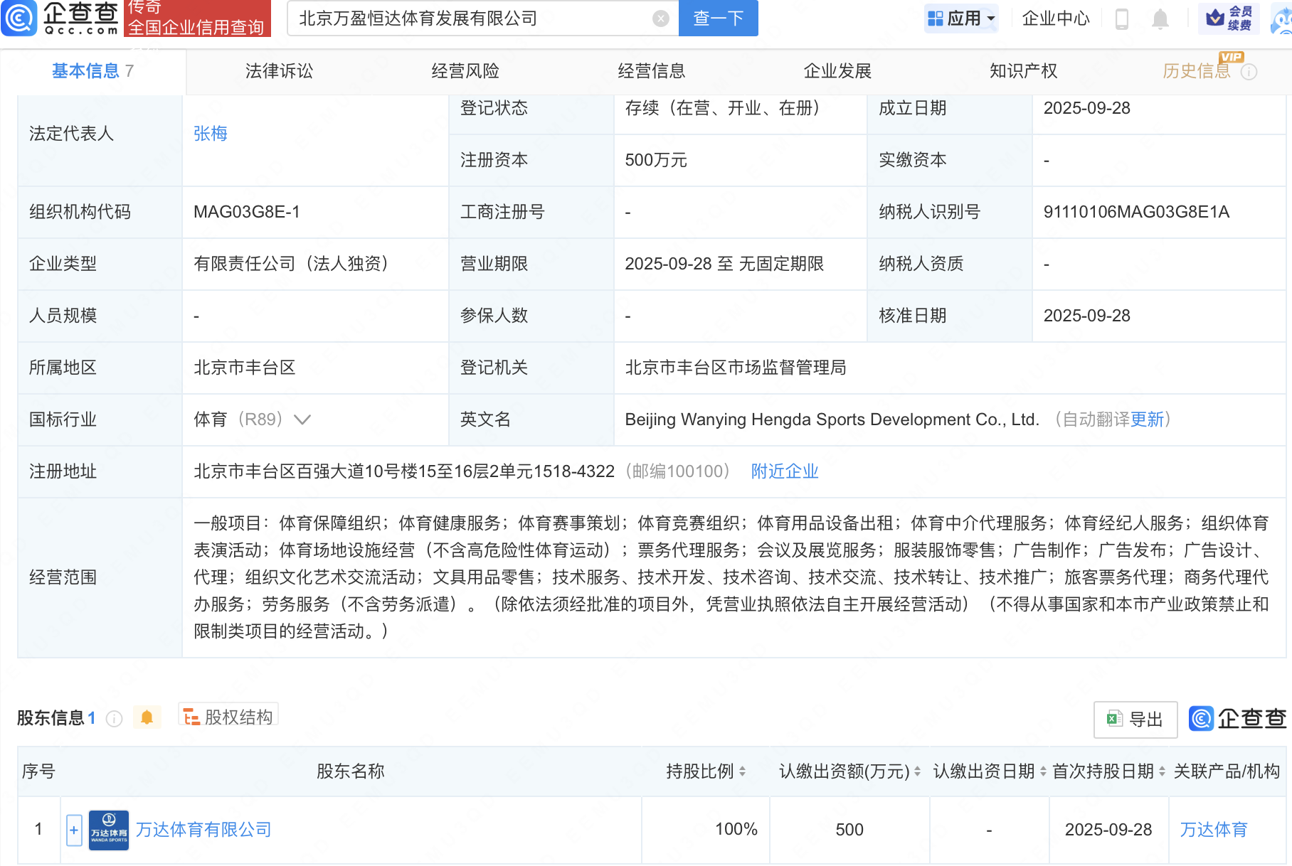 企查查APP显示,近日,北京万盈恒达体育发展有限公司成立,法定代表人为张梅,经营范围包含:体育保障组织;体育健康服务;体育赛事策划;体育竞赛组织等。企查查股权穿透显示,该公司由万达体育有限公司全资持股。
