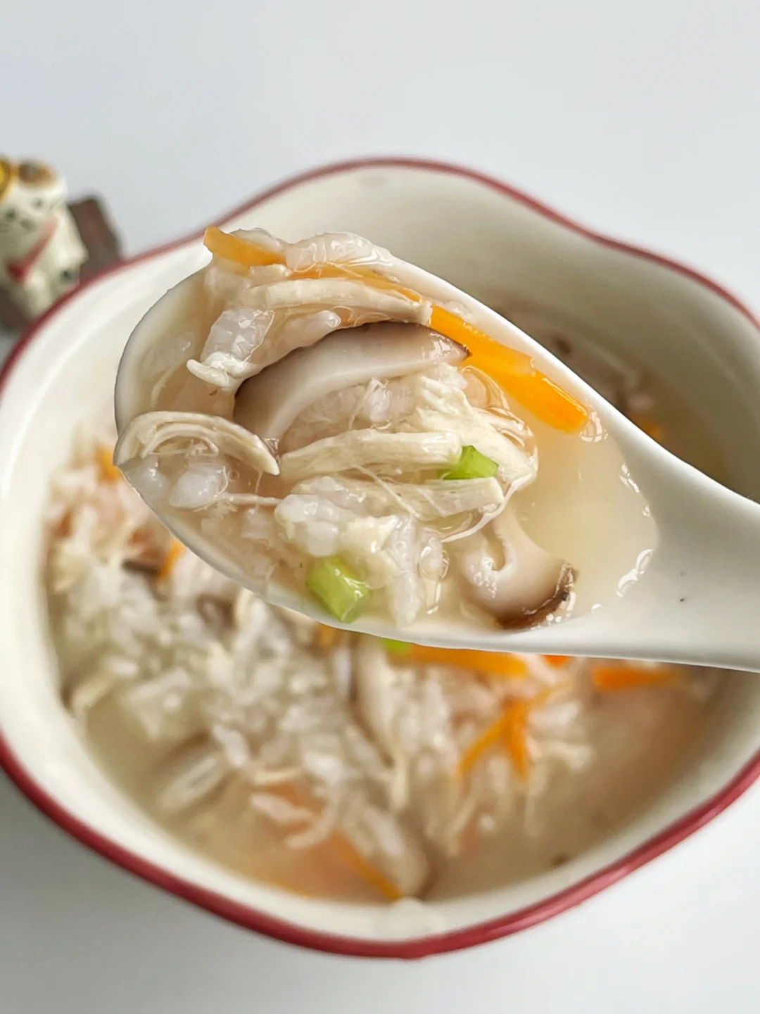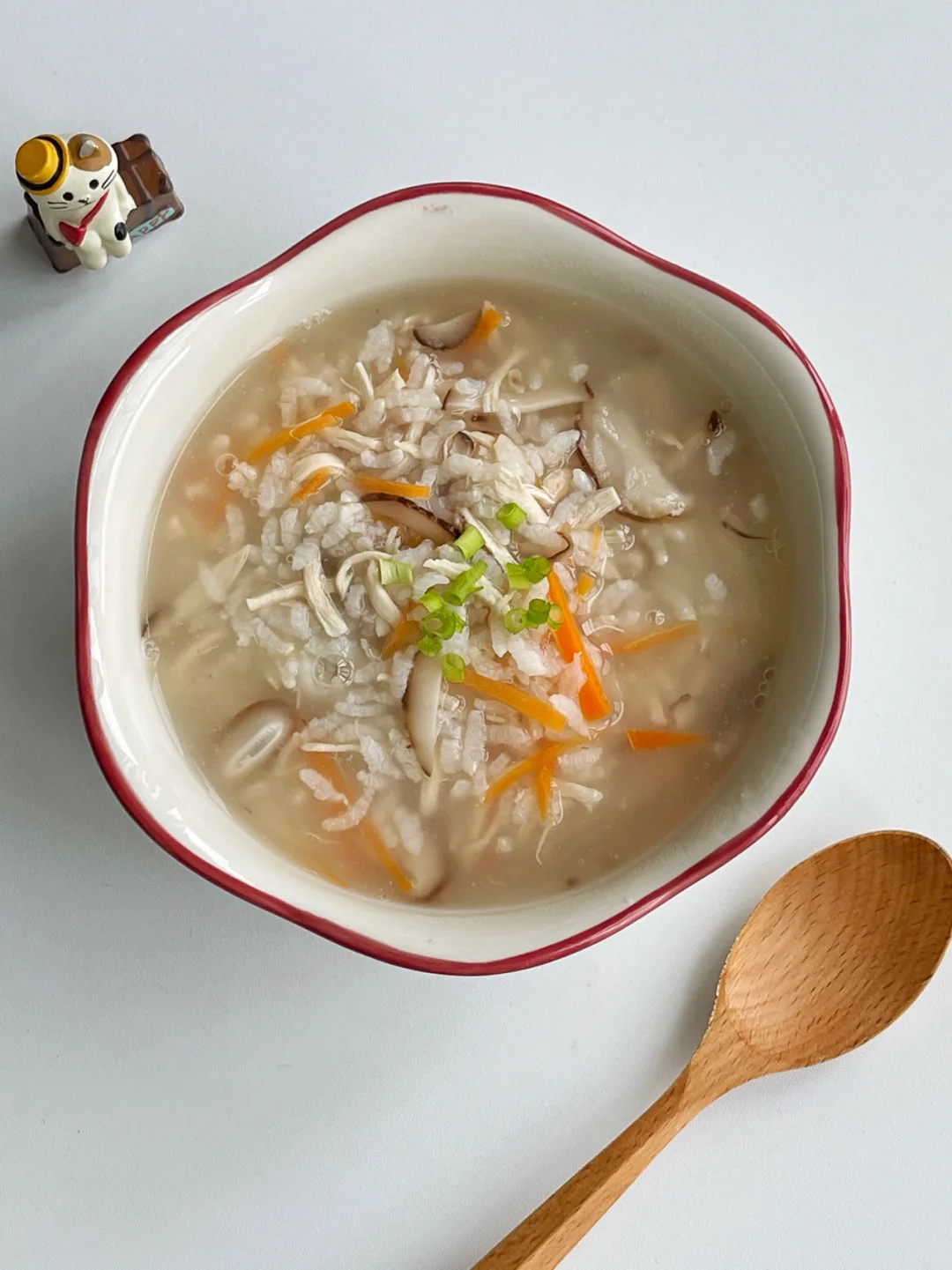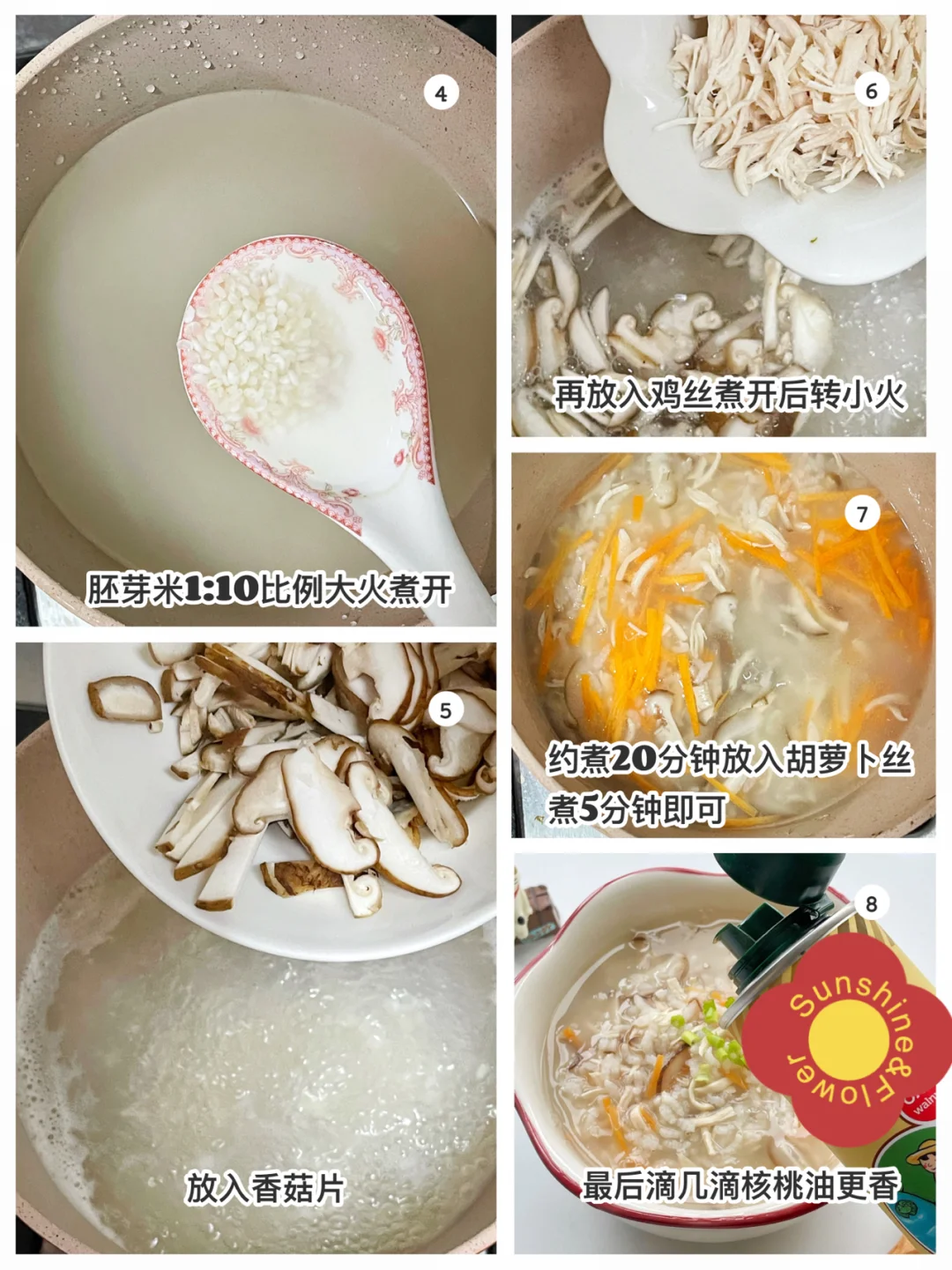 🔹胚芽米冲洗干净,和清水1:10的比例放入锅中煮开,放入鸡丝和香菇片,煮开转小火煮,约煮20分钟放入胡萝卜丝煮5分钟关火。
