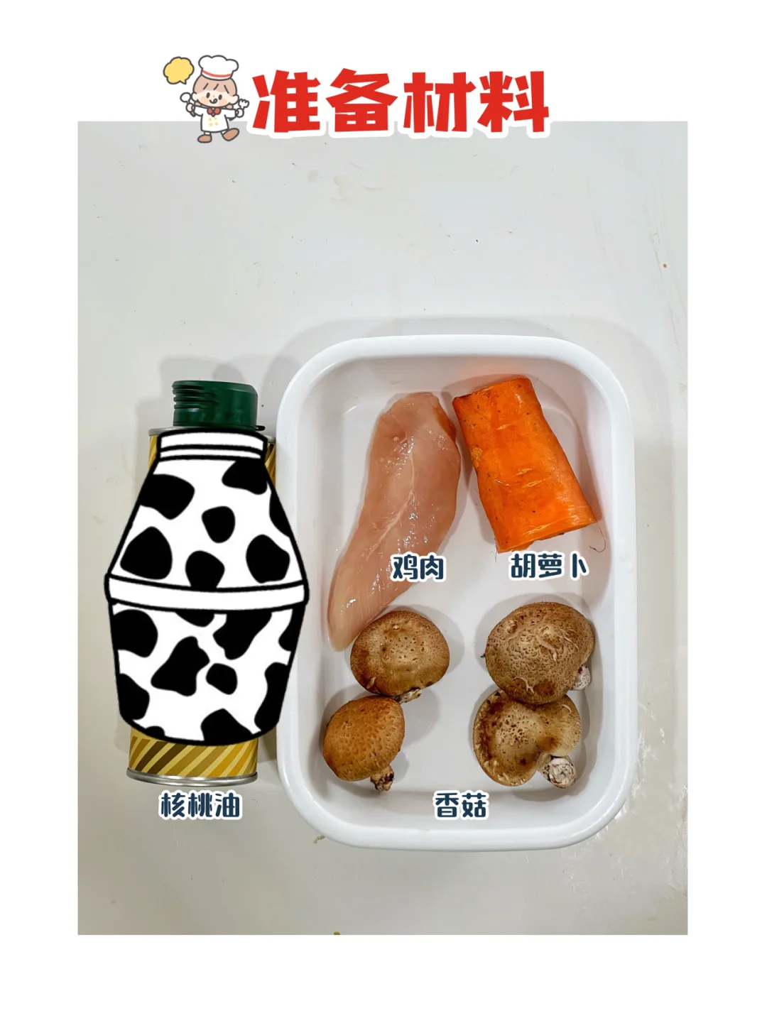 ✅准备材料:鸡肉、香菇、胡萝卜、核桃油 。
