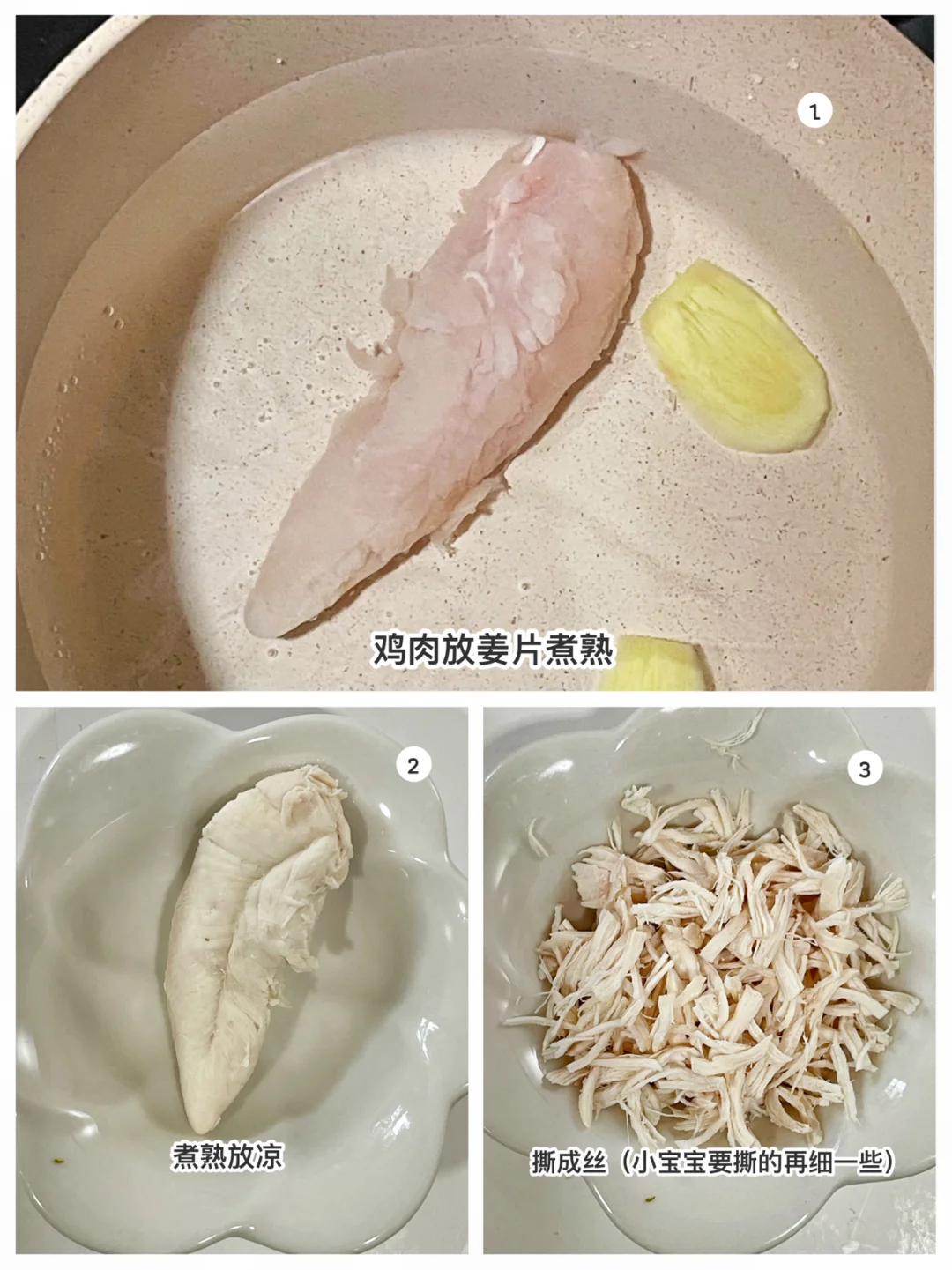 🔹鸡肉和姜片冷水下锅煮熟捞出,撕成细丝(小月龄的宝宝尽量撕的细一些)。