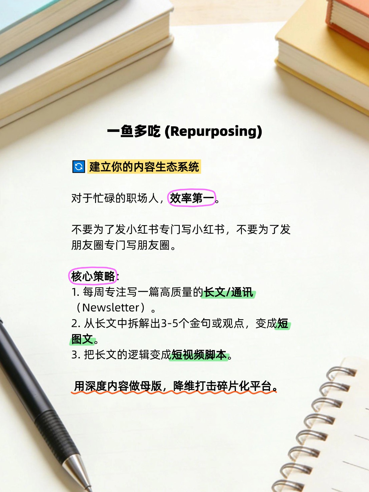 4️⃣ 策略:一篇长文 = N篇短图文,建立高效内容生态。