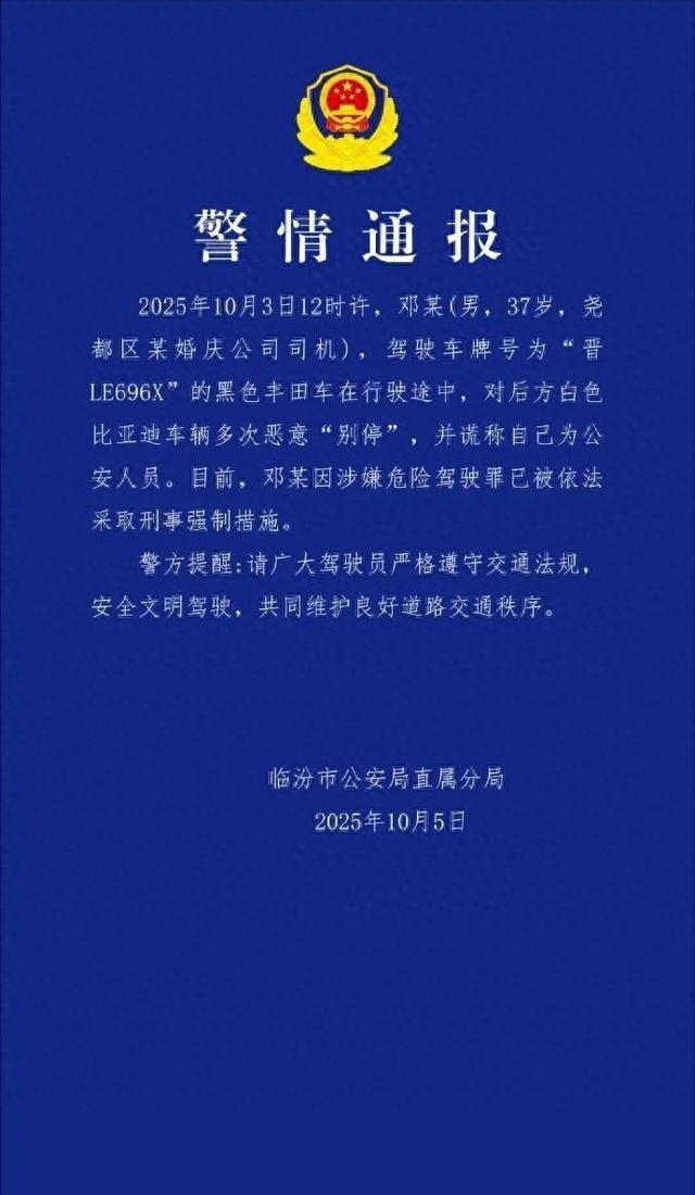 2025年10月3日12时许,邓某(男,37岁,尧都区某婚庆公司司机),驾驶车牌号为“晋LE696X”的黑色丰田车在行驶途中,对后方白色比亚迪车辆多次恶意“别停”,并谎称其为公安人员。目前,邓某因涉嫌危险驾驶罪已被依法采取刑事强制措施。警方提醒:请广大驾驶员严格遵守交通法规,安全文明驾驶,共同维护良好道路交通秩序。