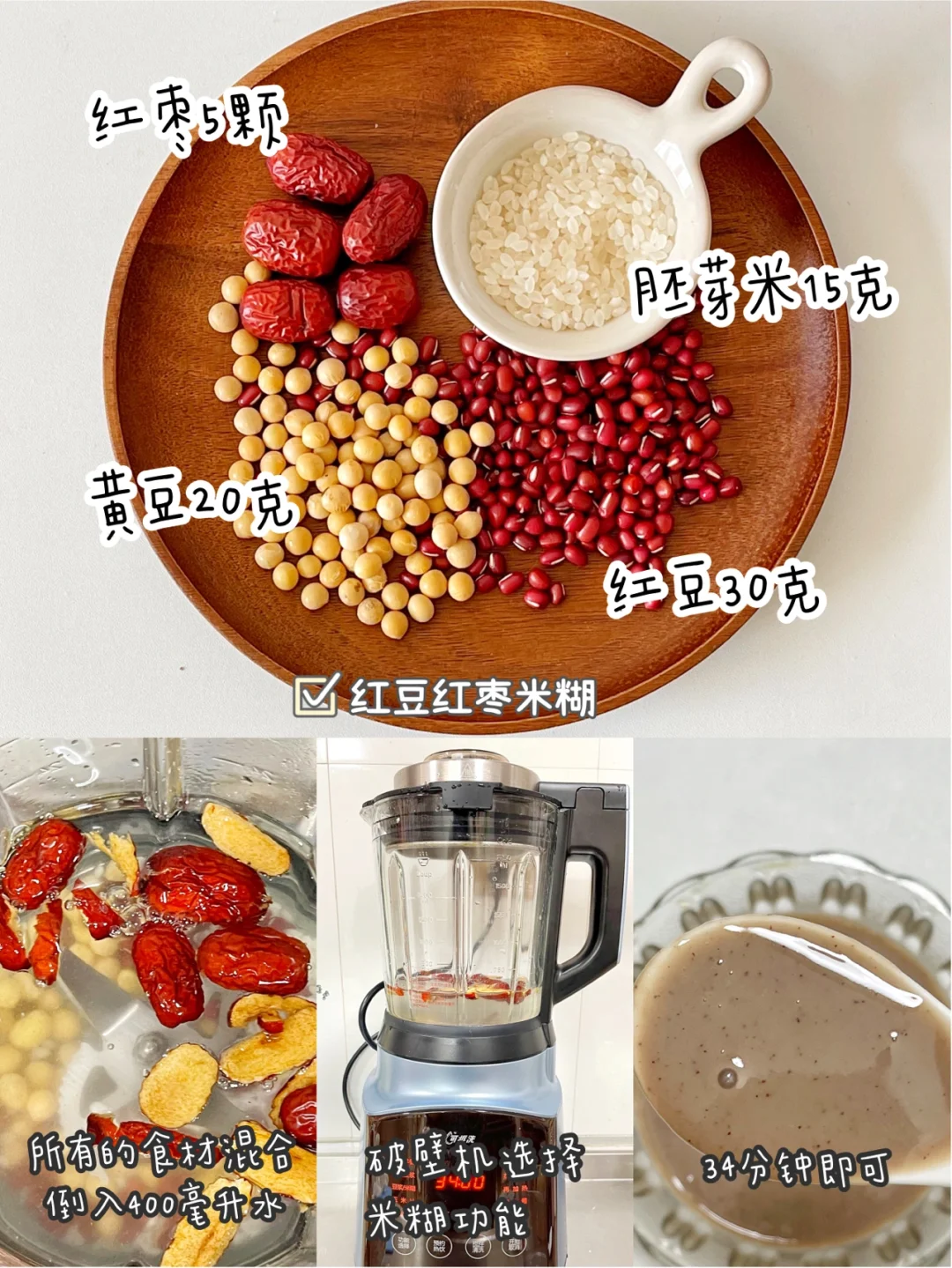 食材:红豆30克、黄豆20克、红枣5颗、胚芽米15克、清水400毫升。