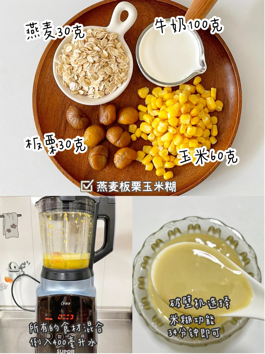 食材:玉米60克、板栗30克、燕麦30克、牛奶100克、清水300毫升。