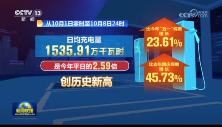 二是10月9日,国家能源局发布监测数据,10月1日至8日,全国高速公路新能源汽车充电量达1.23亿千瓦时,日均1535.91万千瓦时,同比增长45.73%,创下历史新高。