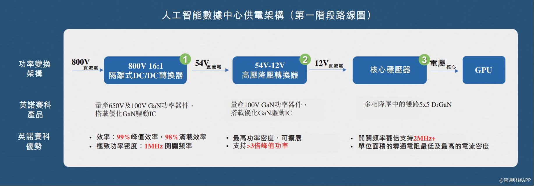 除了向800V机架电源过渡外,该架构还要求在800V到1V的电压转换中实现超高功率密度和超高效率。只有氮化镓功率器件(GaN)能够同时满足这些严苛要求。