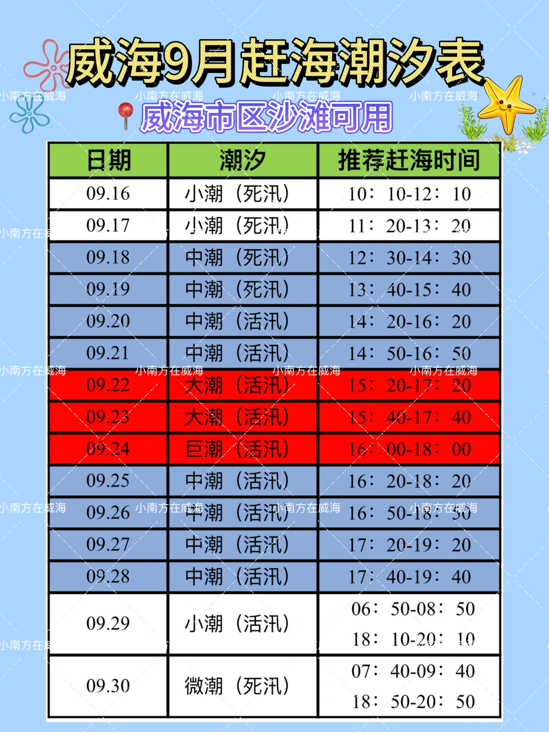 表格中的赶海时间适合威海市区内所有的沙滩,姐妹们按表格中的时间带上装备去赶海就可以拉!