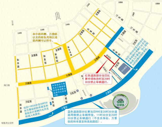 四、观众车辆在和丰路两侧、万鼎路的和丰路至共享街两侧和万鼎路以北的梭鱼湾地区道路停放。