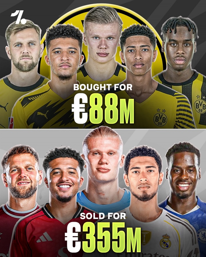 直播吧10月15日讯Onefootball列出了近年来多特蒙德在转会市场上的一系列优秀操作,花费8800万欧元签下哈兰德、桑乔、贝林厄姆等5名球员,并以总计3.55亿欧元将他们出售。