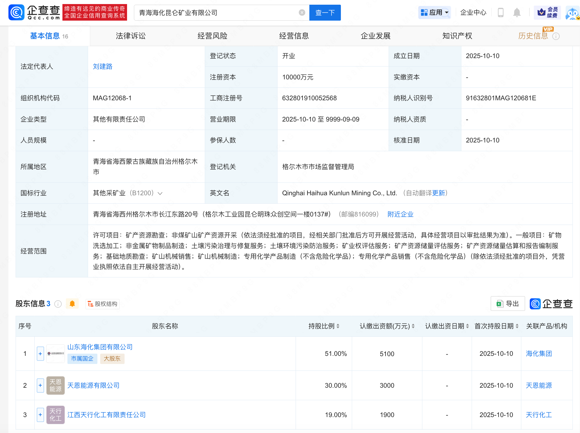 企查查APP显示,近日,青海海化昆仑矿业有限公司成立,法定代表人为刘建路,注册资本1亿人民币,经营范围包括矿产资源勘查、矿物洗选加工、非金属矿物制品制造等。企查查股权穿透显示,该公司由山东海化集团有限公司、天恩能源有限公司、江西天行化工有限责任公司共同持股。